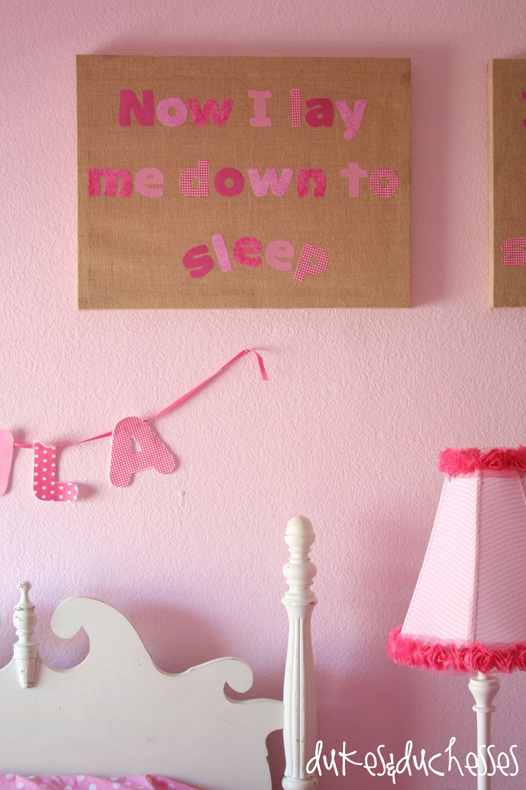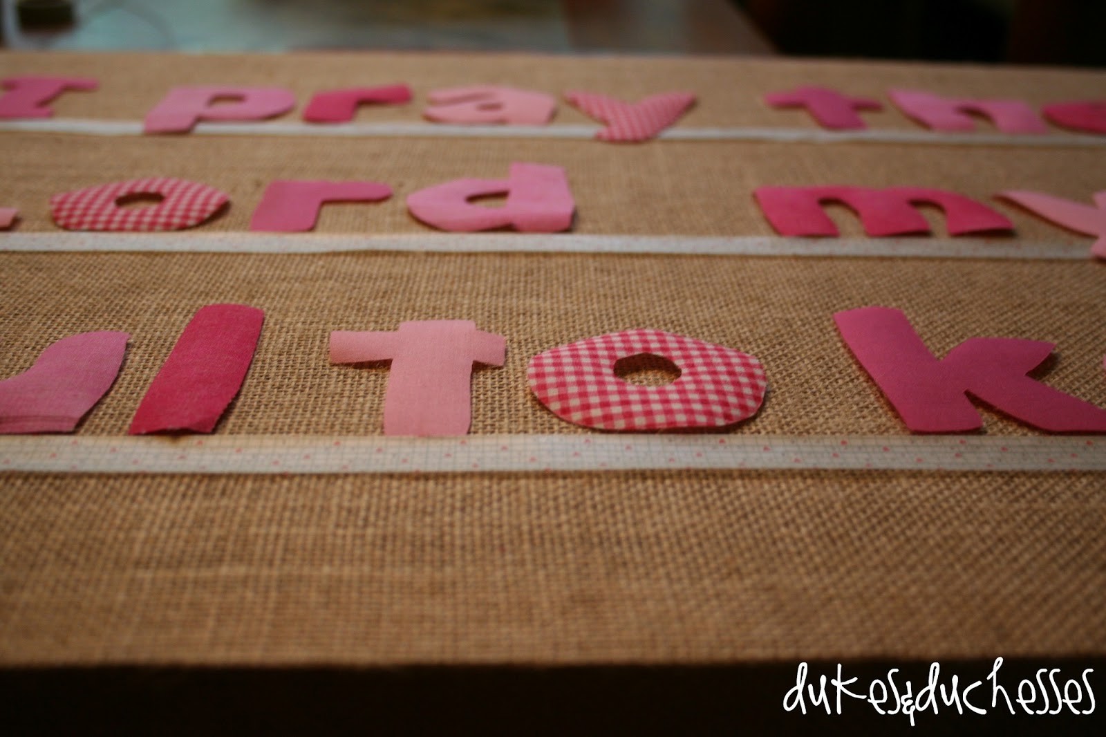 The fabric I used in the prayer art coordinates with their no-sew name garlands and really completes that wall.