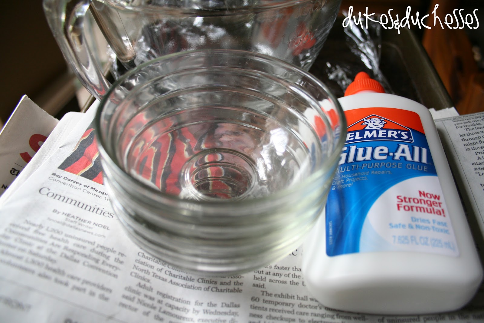 … but I had everything else at home. You’ll need a mixing bowl, white glue, small bowls to use as molds, plastic wrap, and newspaper.