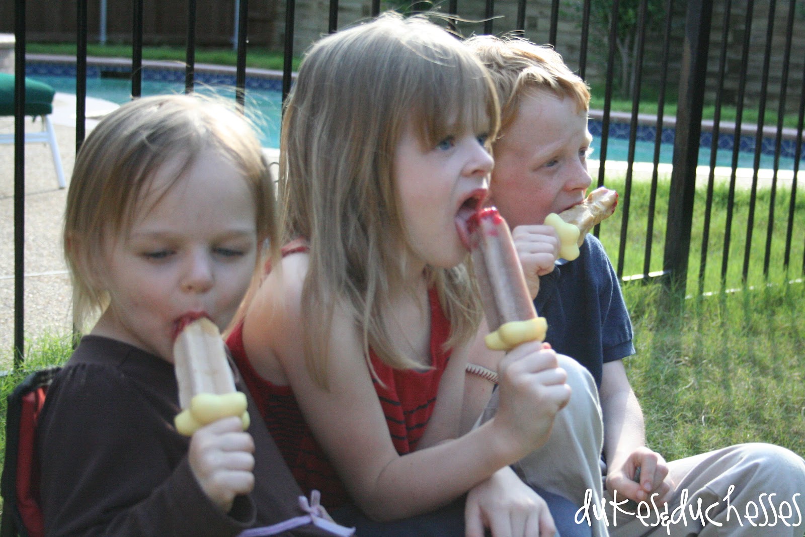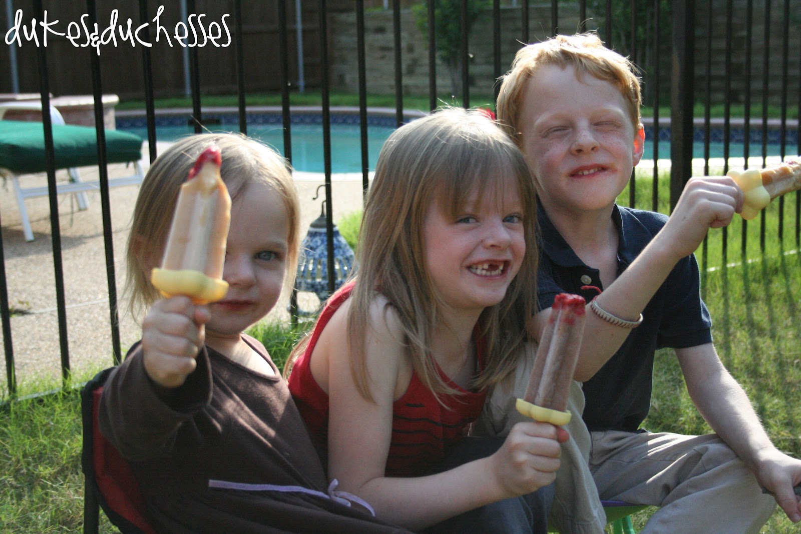 The three younger kids grabbed a chair in the backyard {all side by side … I couldn’t resist snapping a photo} and gobbled up their yogurt smoothie popsicles. They all loved the flavor … we’ll be making these simple popsicles again.