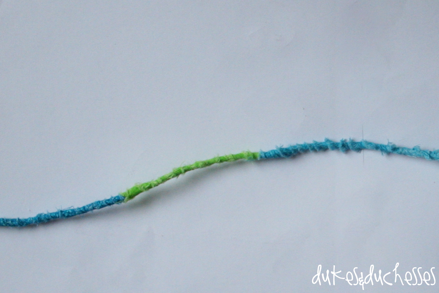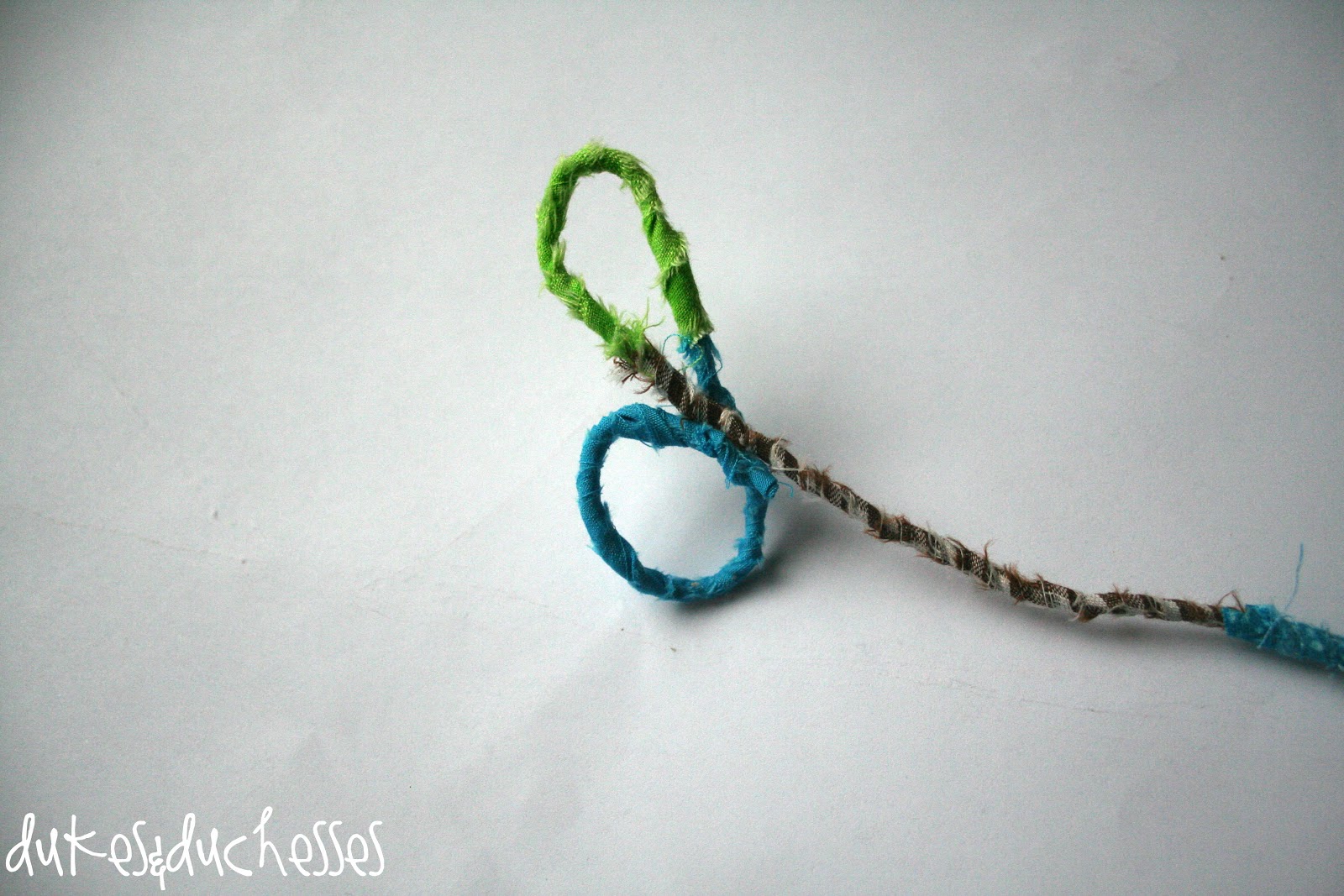 I ripped fabric strips {about 1/4-1/2 inch wide and about three inches long} and wrapped them around the wire. Where the strips change to other colors, I just wrapped the new color tightly over the old color and over itself {you could also add a drop of hot glue … I did that at the very end to hold everything in place}.