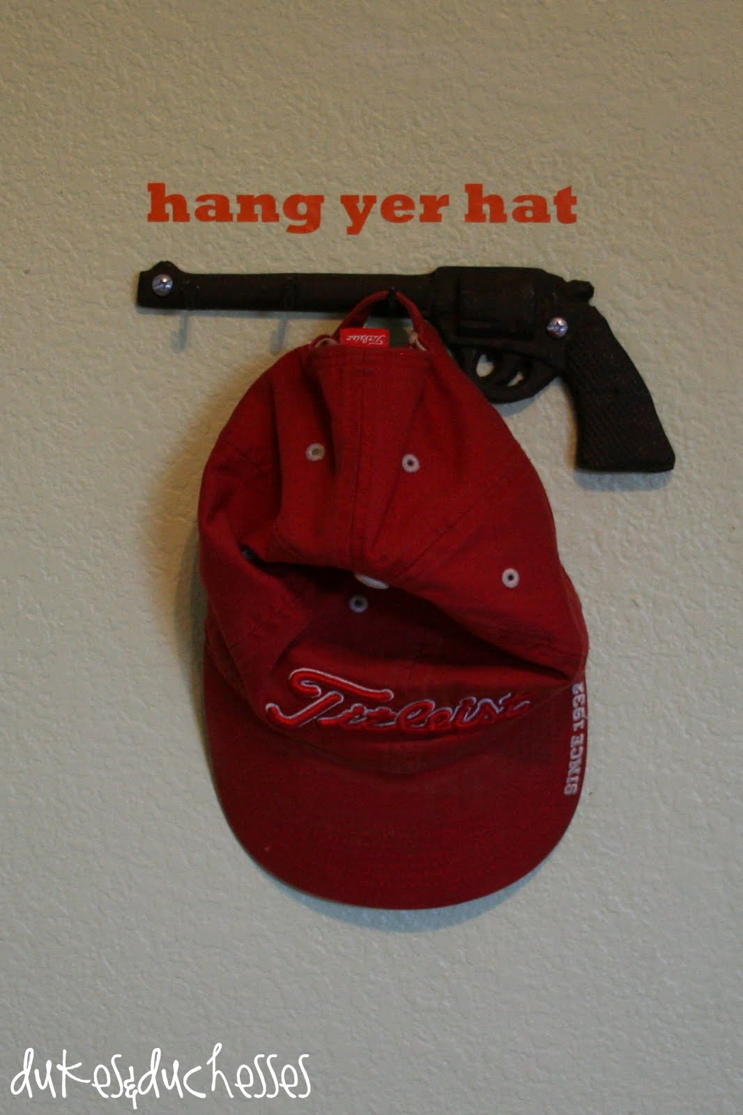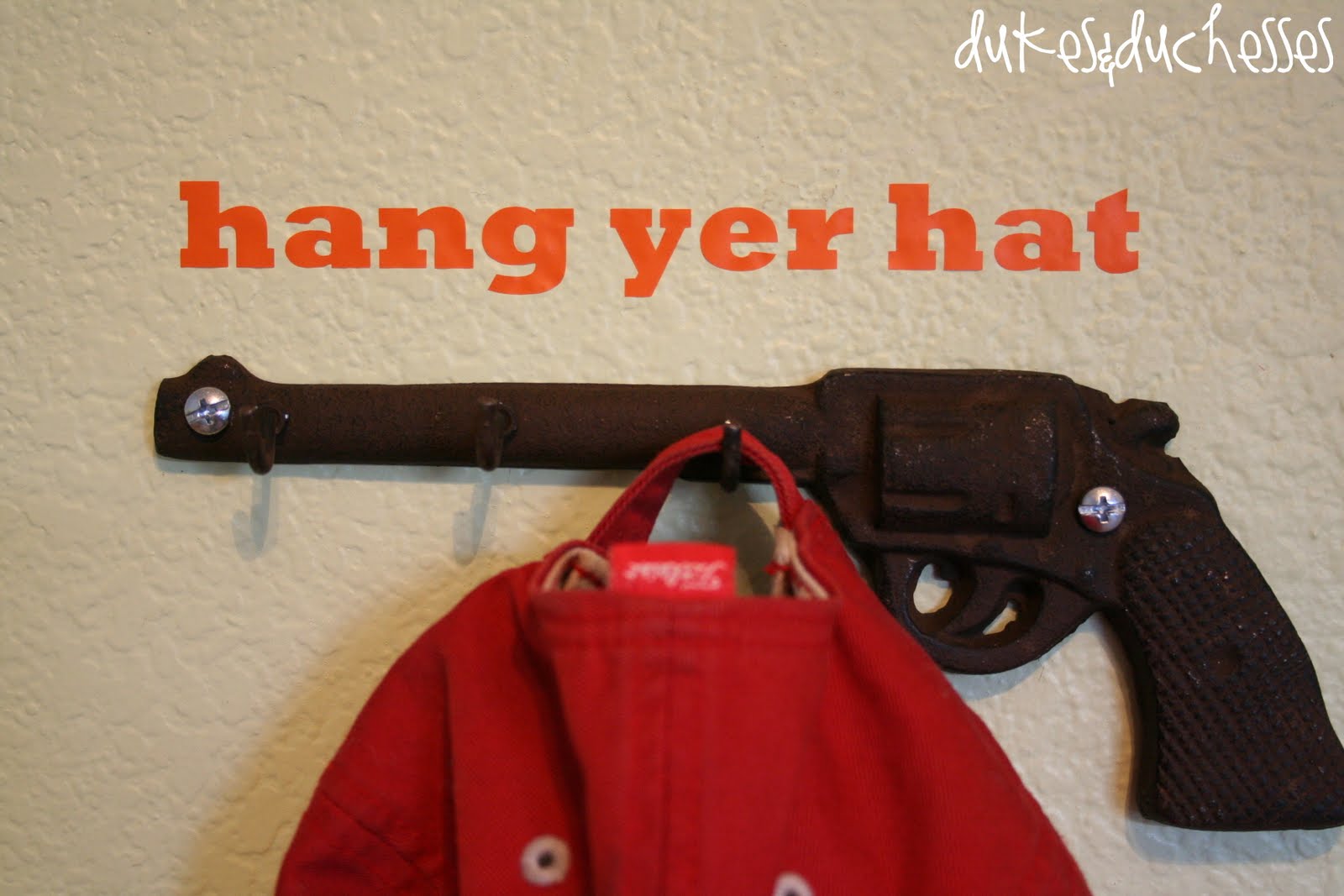 While in Canton last month, I found a wrought iron gun with hooks amidst all the wrought iron cowboy decor. I knew Luke would love it and thought it would be a fun accent in his cowboy room.