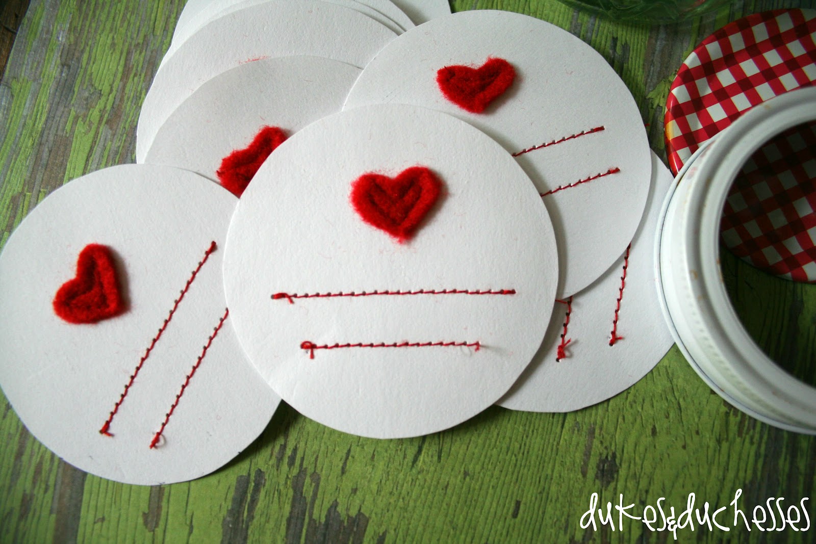 I cut circles from heavy white cardstock, sewed two lines with red thread, and stitched on a red felt heart.