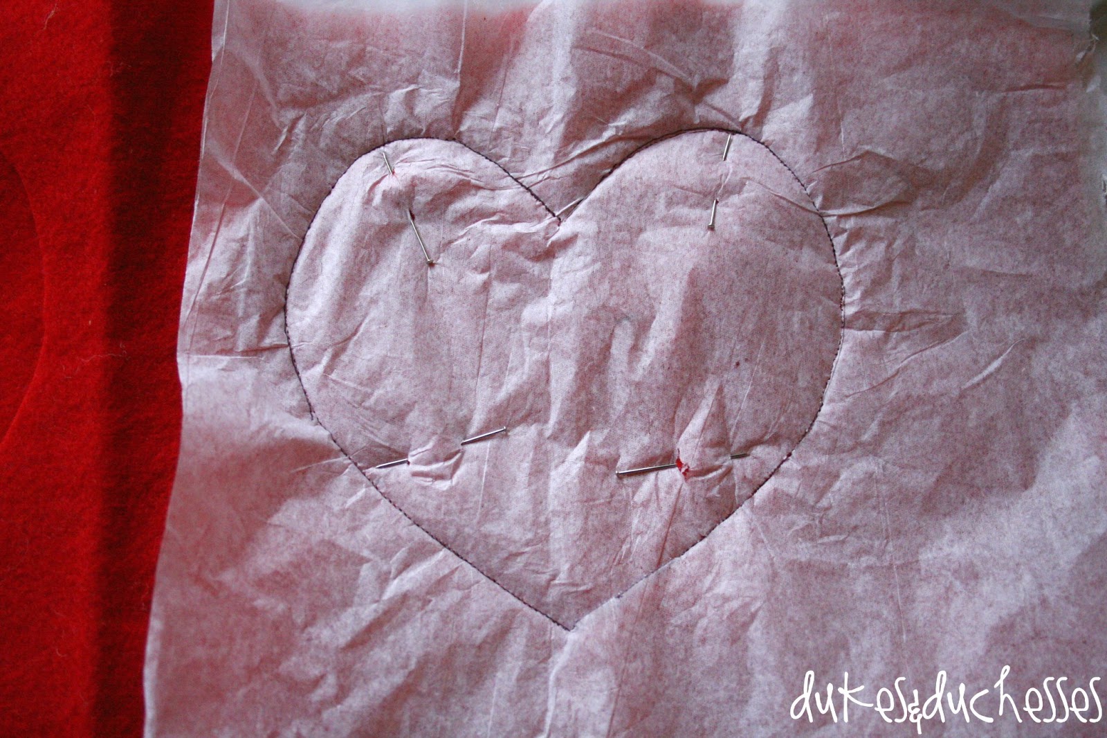 When the buttonhole is finished, place tissue paper over the area {making sure the buttonhole is in the center}, place another piece of felt underneath the piece with the buttonhole, trace a heart onto the tissue paper, and sew right over top of both the tissue paper and the felt.