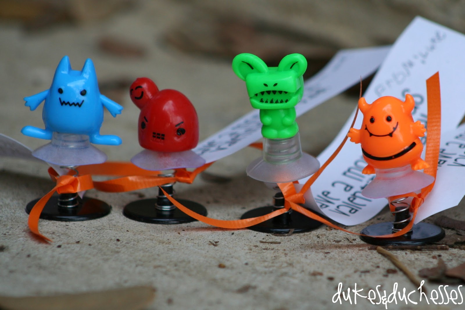 … and added a simple printed tag: “have a monstrous Valentine’s Day!”. We just typed it up on the computer in a fun font, printed them out, and trimmed them to tag size, then punched a hole in one end and tied them on with a ribbon.