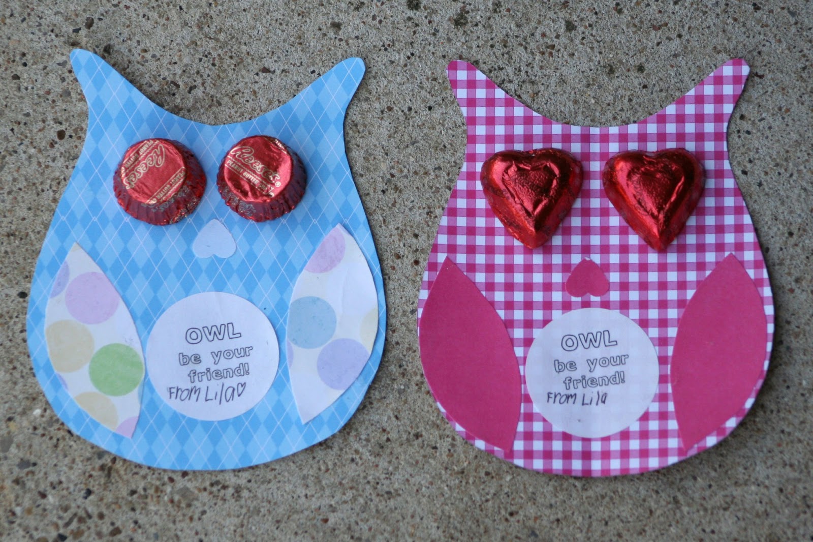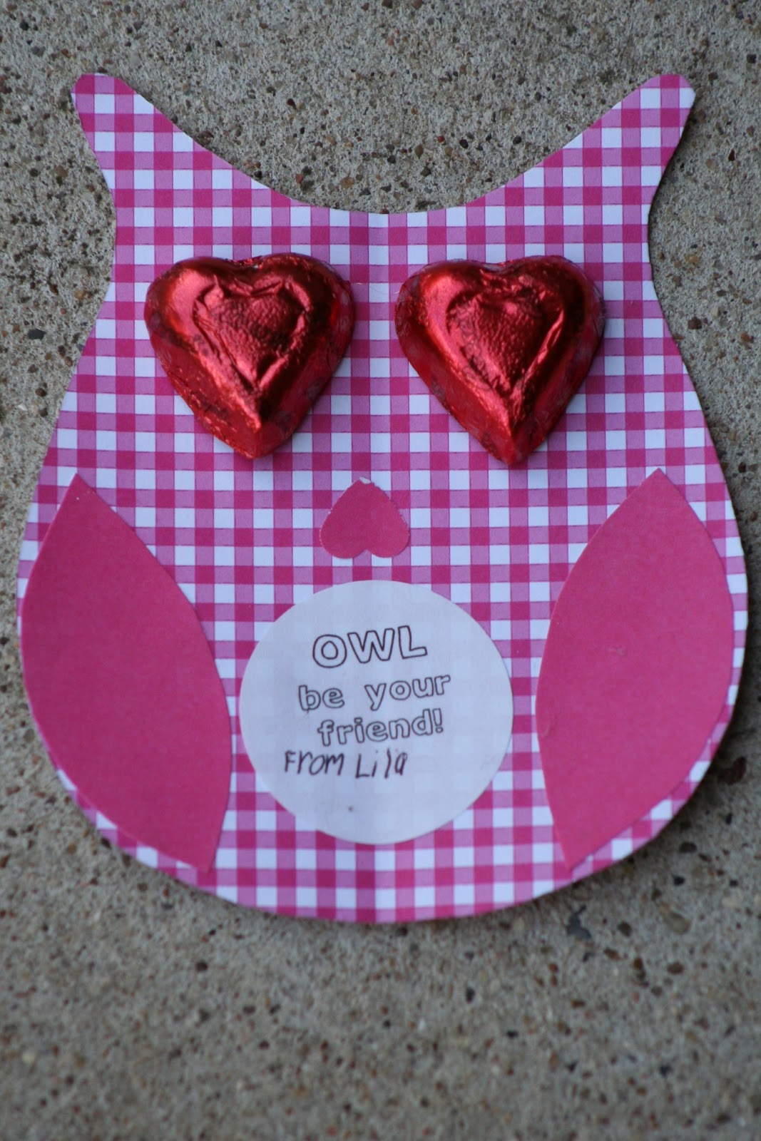 Today I’m sharing Lila’s homemade owl valentines. Lila {who is six years old and never online} is certain she came up with this idea herself, including the “owl be your valentine” tag line. I don’t have the heart to tell her that owls are really popular and something like this has probably been done before.