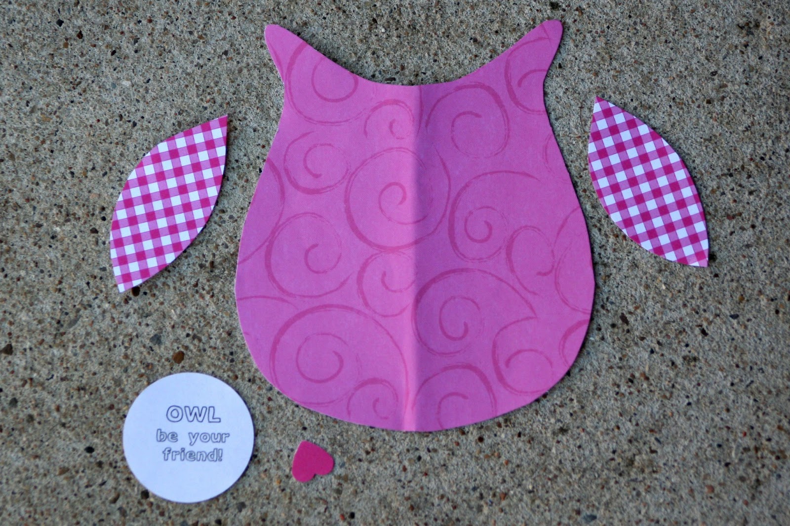 Let me tell you how I made them. I made my own owl template and then used it to cut body pieces and wings out of coordinating scrapbook paper. We used a small heart punch for the beak …