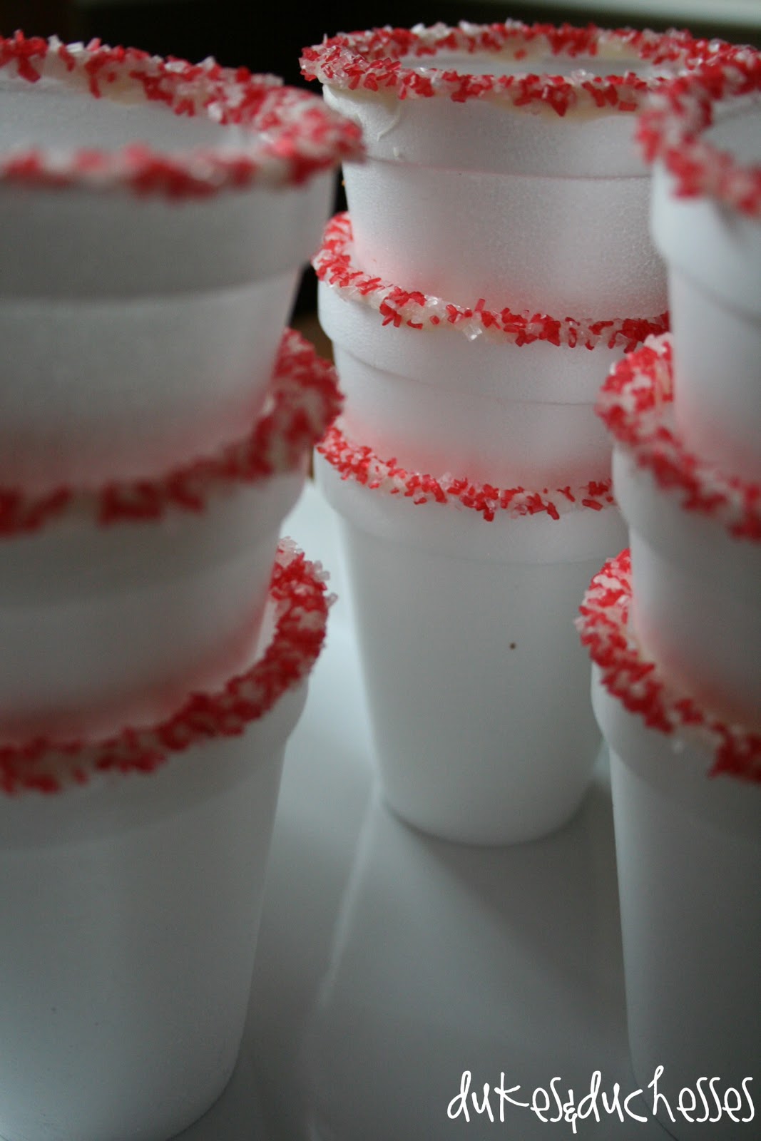 Set out styrofoam cups edged in white chocolate and sprinkles. These red and white sprinkles had a peppermint flavor that was the perfect complement for cocoa.