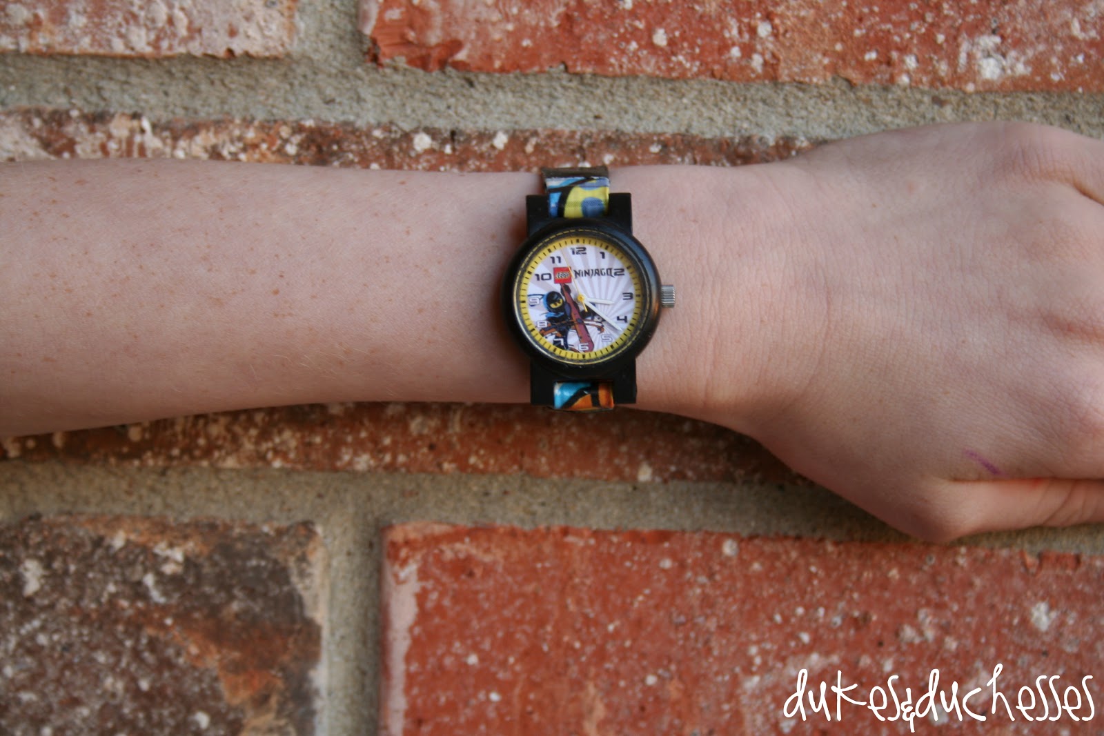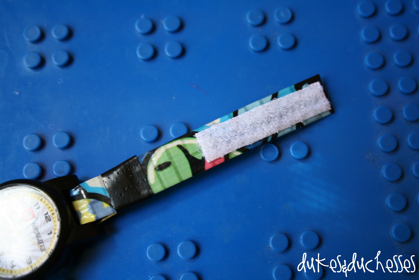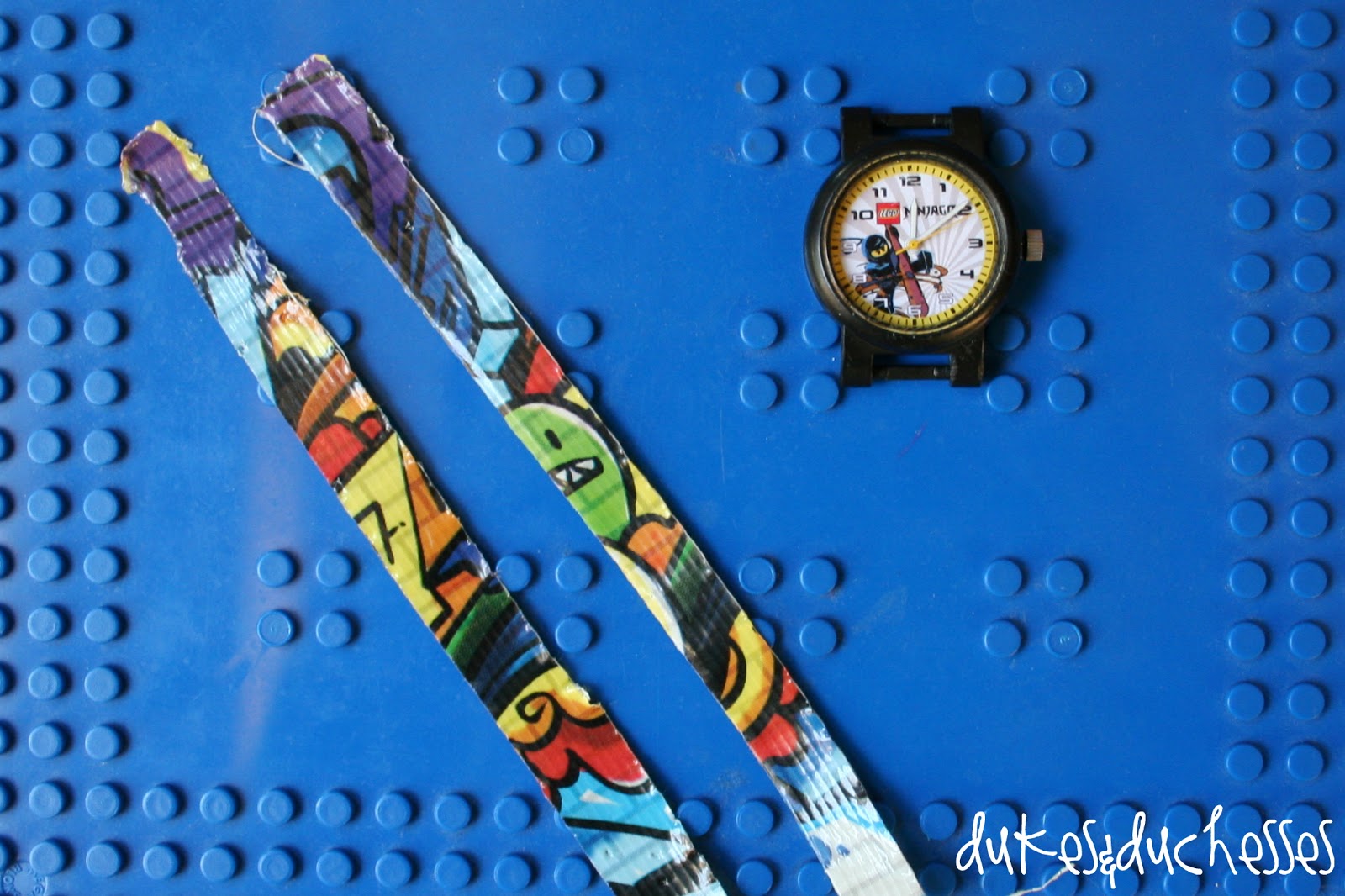 Luke has a neat Lego watch but the strap is constantly falling apart or falling off his wrist so we decided to replace it with a colorful duct tape watch band.