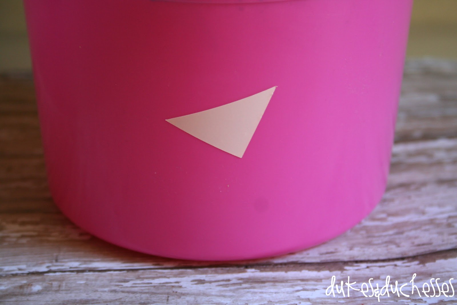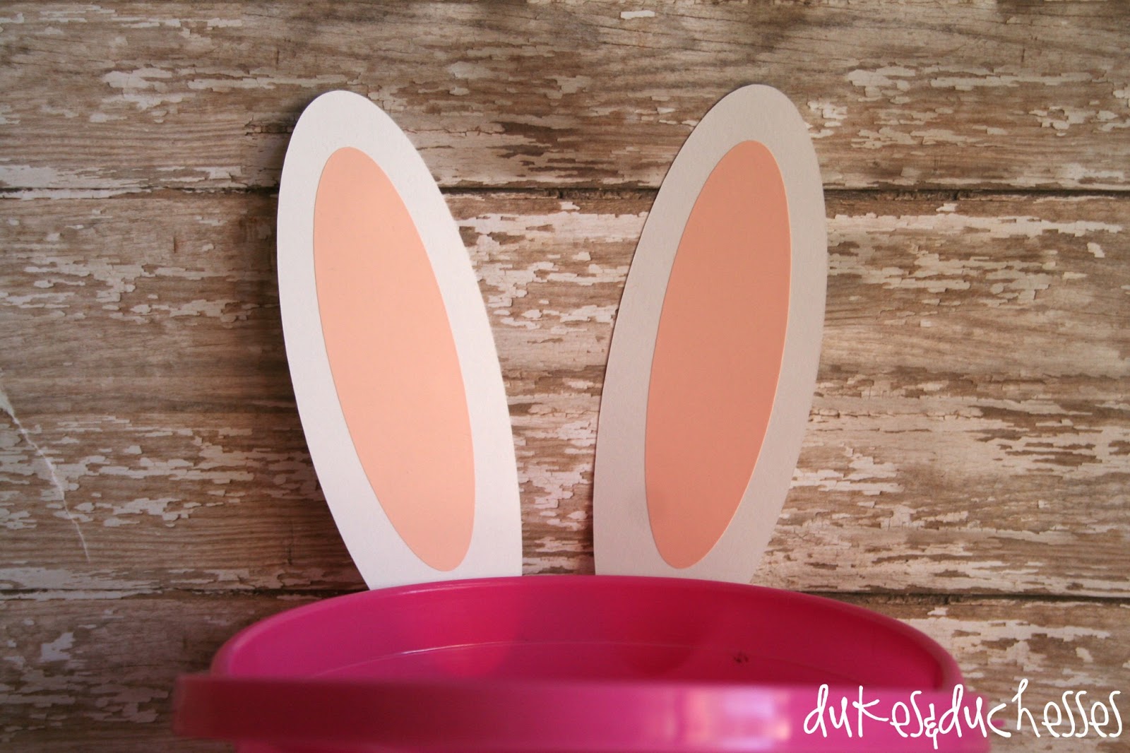 I started with a plain $1 pink pail that I bought at Party City. You can find similar buckets at big box and dollar stores during Easter season. I used my cutting machine to cut white ovals for ears and stuck smaller pink ovals in the middle {the ovals are cut from pink vinyl}. If you don’t have a cutting machine, you can do this part manually with scissors. You could also use pink paper instead of vinyl.