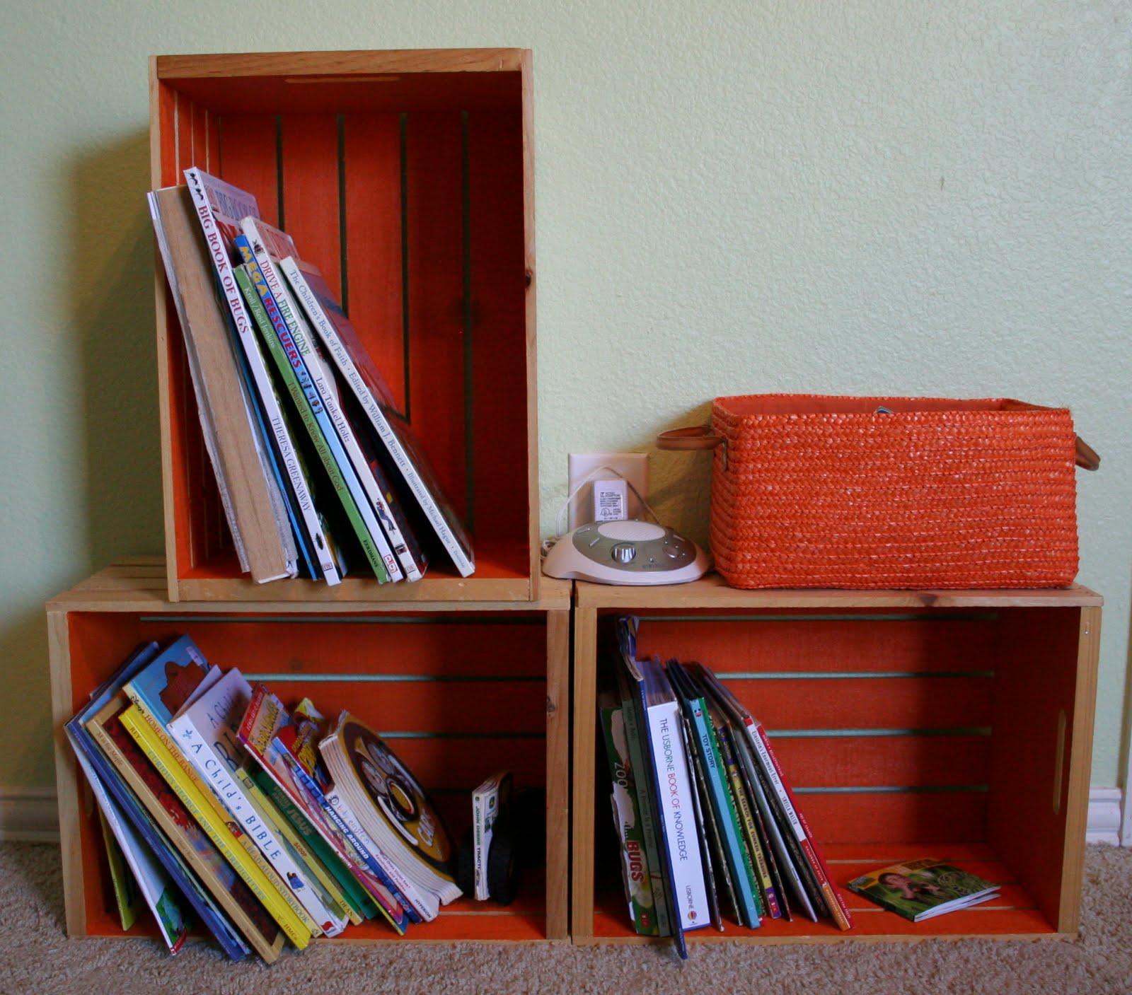 I tackled the job yesterday during naptime, thinking it would be super quick. It wasn’t, and I finally finished today. The job was a bit finicky, painting the individual boards {which soaked up a lot of paint} but I love the way it looks. I painted them with Valspar Island Orange. Luke has a number of orange accents in his room and the crates tie in nicely.