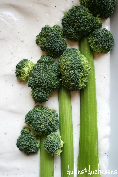 I covered a large platter with storebought ranch dip and spread it evenly with a spatula then added some jungle details with vegetables. I used celery stalks and broccoli florets to make trees …