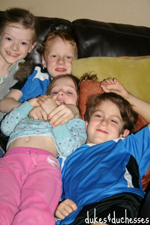 The kids filled their plates with snacks, found a spot on the couch {on top of each other, apparently} …