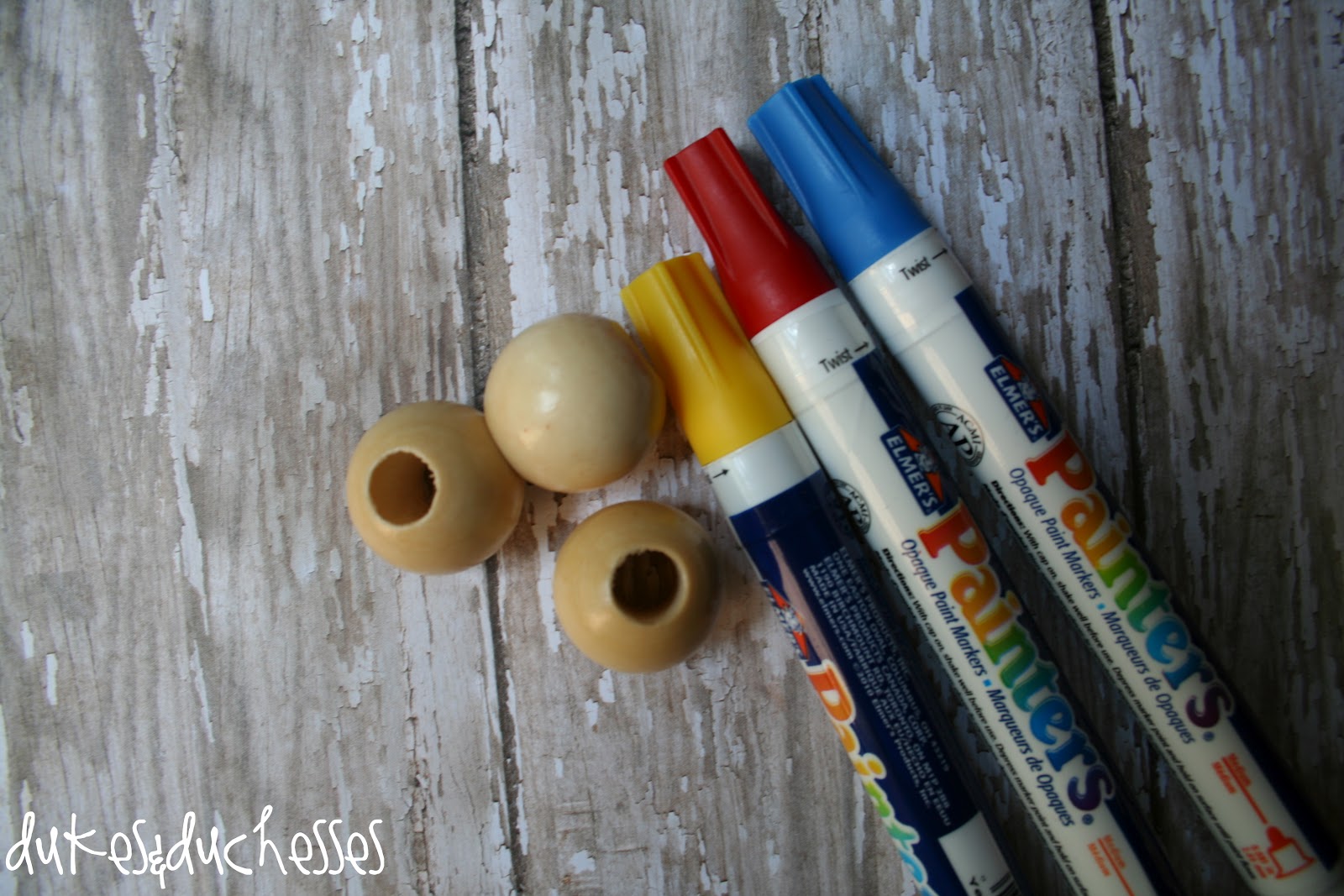 I used wooden beads and paint pens and had all three finished in about ten minutes.  My kind of project!