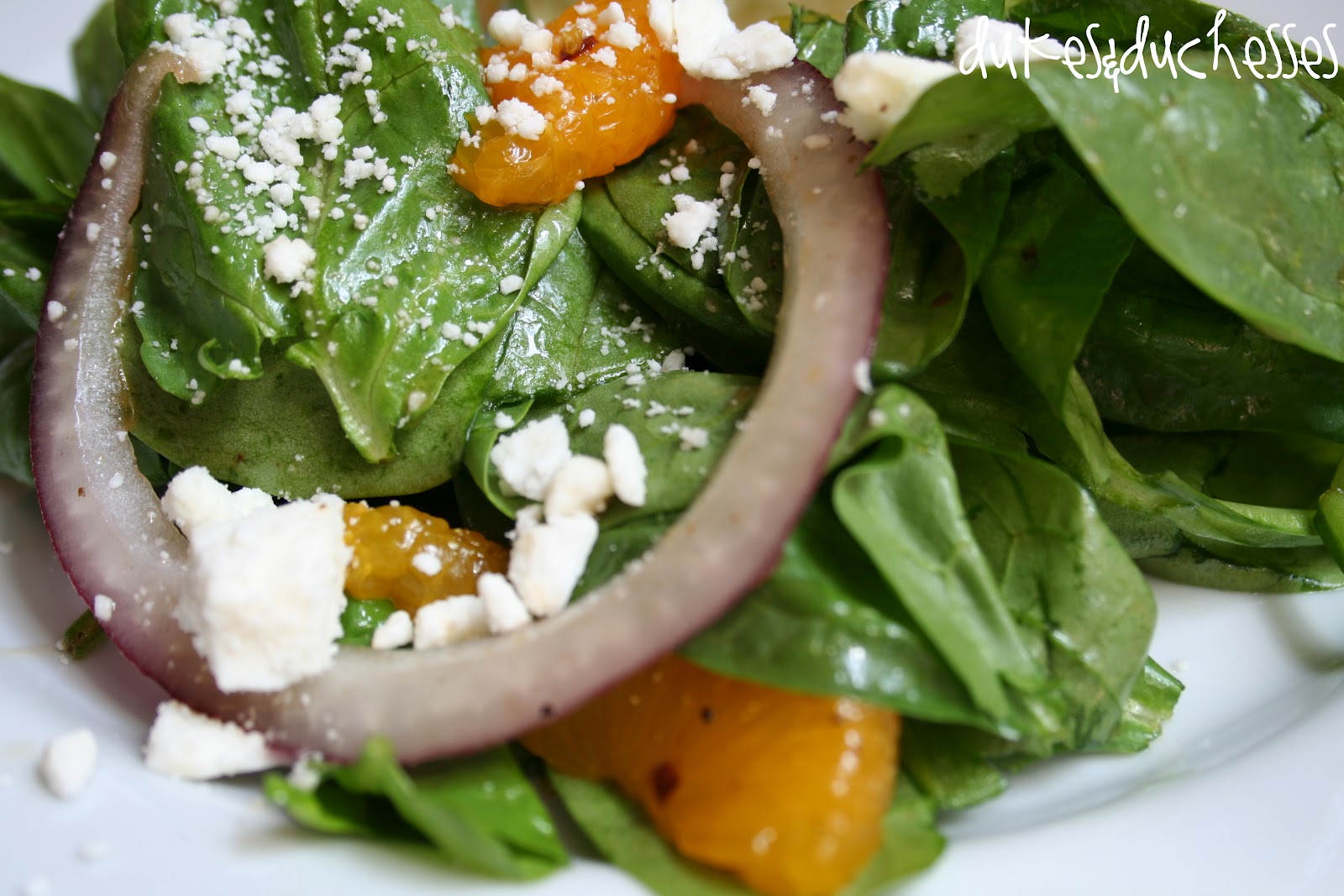 Combine the fresh spinach, drained mandarin oranges, black olives, and red onion in a bowl.