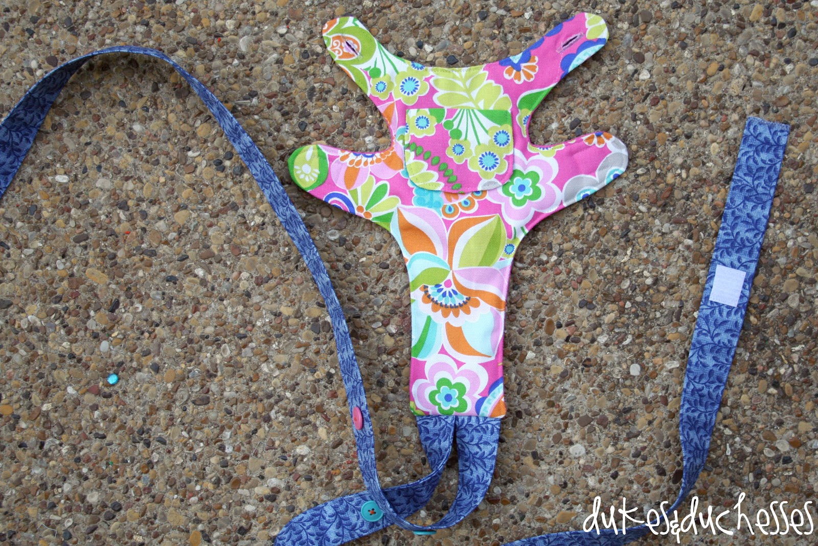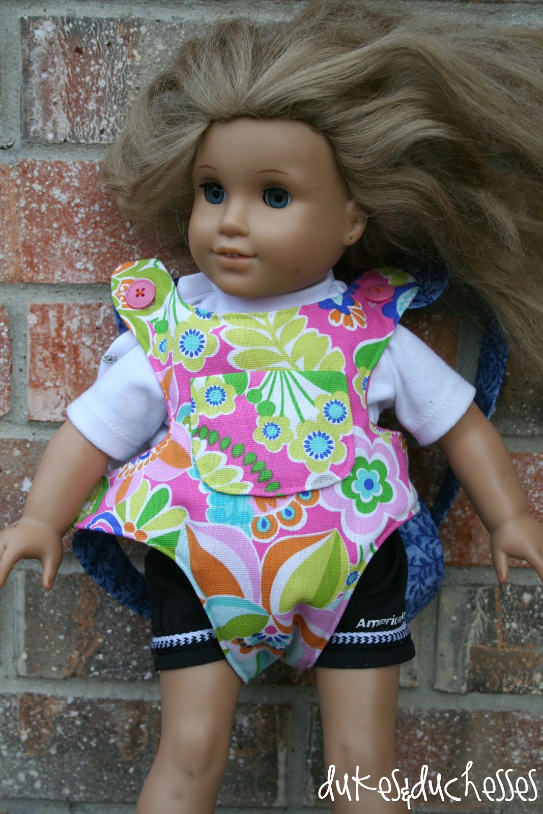 I used two different colors of buttons and sewed them on with orange thread just to make it a bit more childlike and whimsical. The different button placements allow the carrier to adjust for different sized dolls.