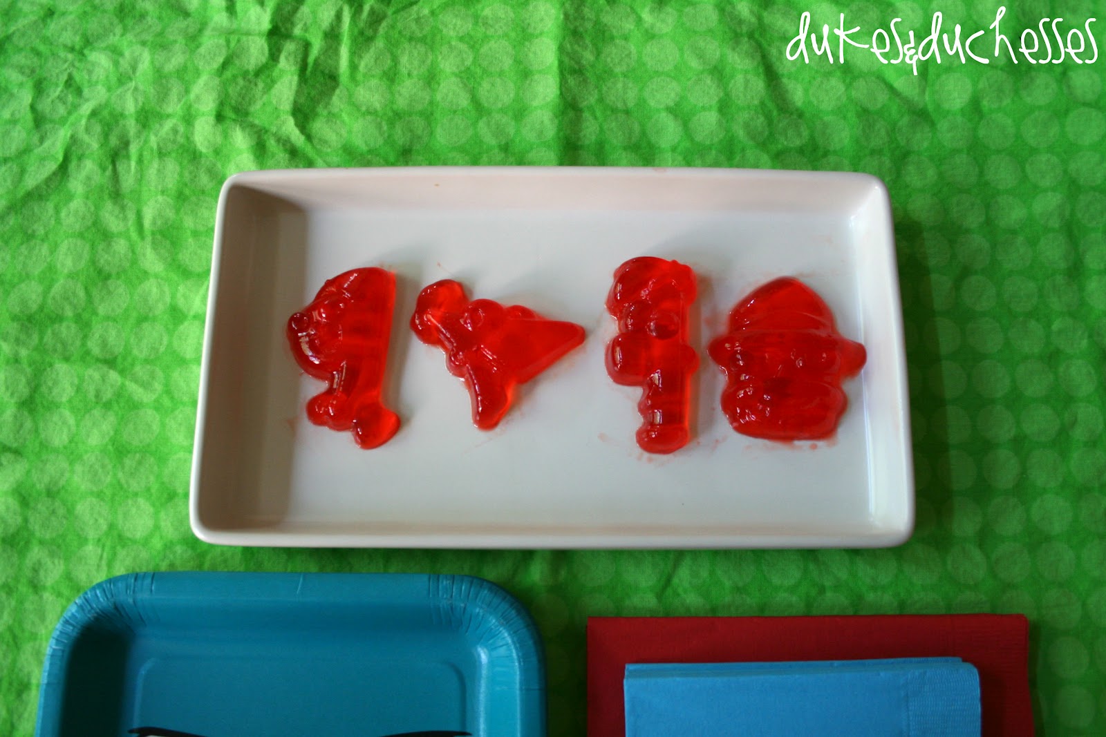 Because the kids love Jello Jigglers and we found a fun mold, we served Phineas and Ferb {and friends} Jello Jigglers alongside the cake.
