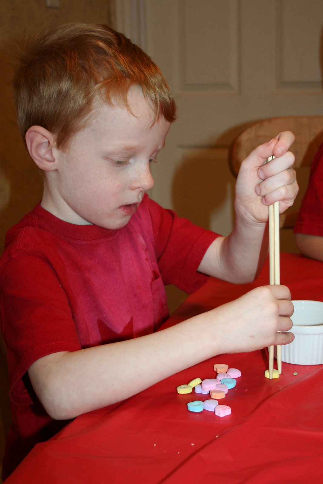 … and Chopstick Pick Up {transferring small conversation hearts into a dish using only chopsticks}. Both games were a hit with the kids.