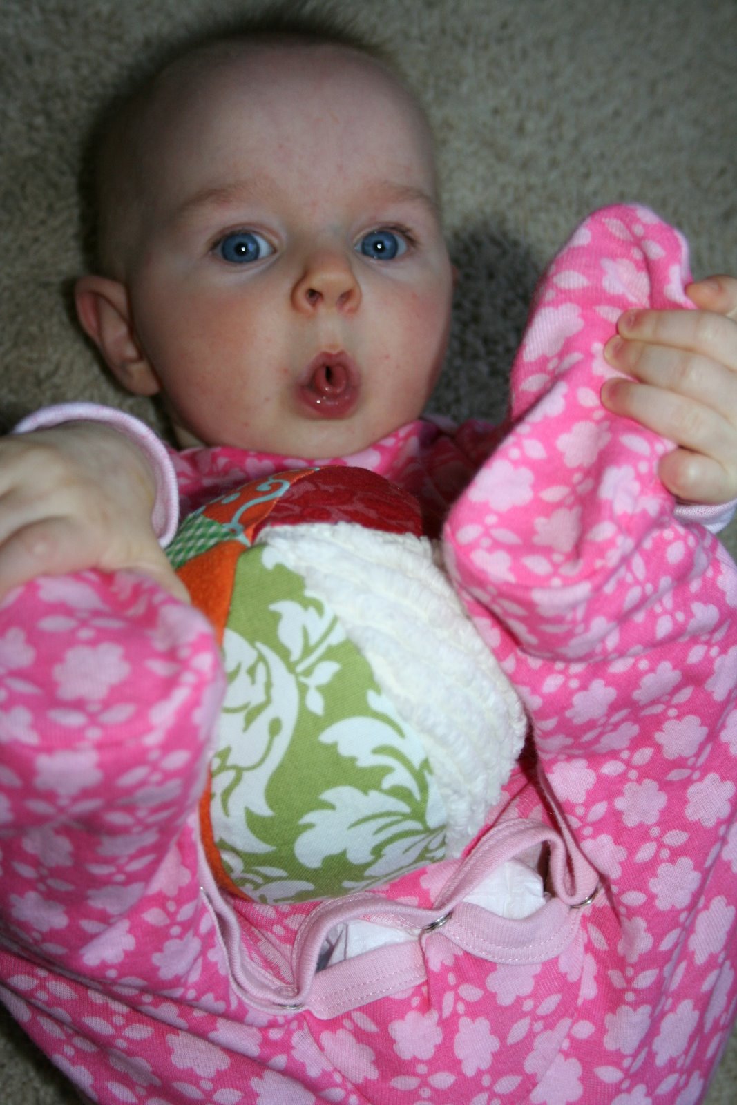 Tate is at the age where she really enjoys holding onto things and playing with toys so I grabbed some scraps and sewed her a ball (using this template/pattern). I filled it with bells so it’ll jingle when she tosses it around.