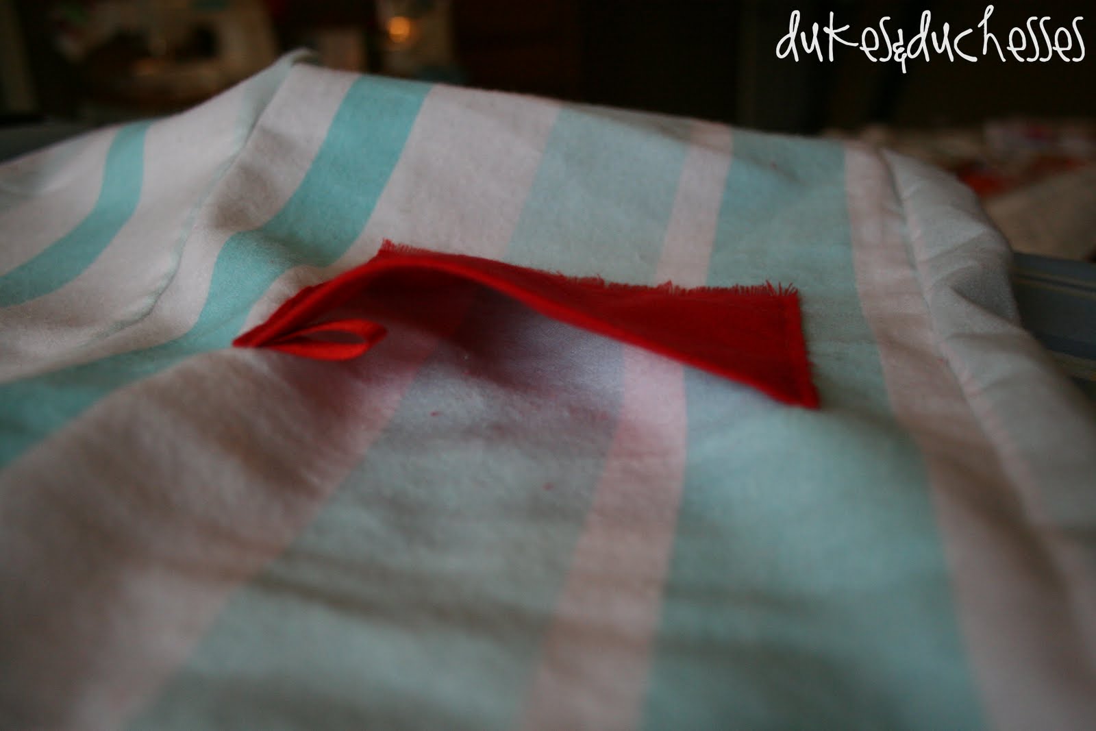 I chose fabric that was a bit more updated and fun than just plain navy {Polar Express always makes me think of navy} and I paired it with a bit of red. I cut standard pajama pieces, following a pattern, and added pieces for cuffs and a pocket.