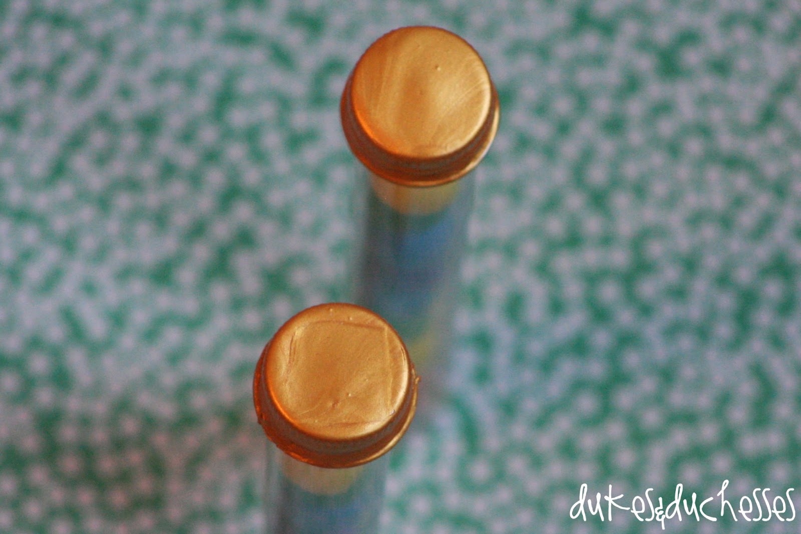 Originally, I wanted to stuff a gold foil-wrapped Rolo in the bottom of the tube {like the pot of gold at the end of the rainbow} but it was a bit too wide for this tube. Instead, I dipped the lids into gold paint and turned them into little pots of gold at the top of the tube. That detail might be lost on the kids but it’s not lost on me {wink}.