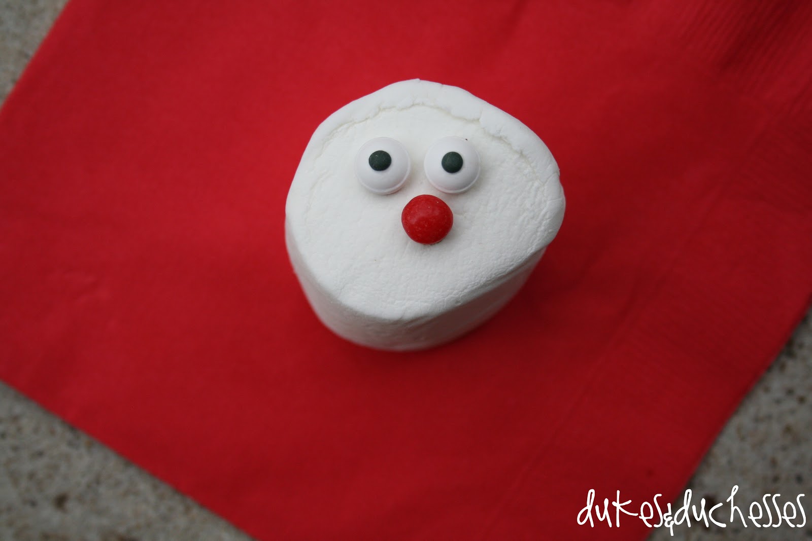To make the reindeer faces, I used a jumbo marshmallow and stuck the edible eyes and a cinnamon candy nose on with a dab of candy melt. Unlike this photo, you need to make the reindeer face on the side of the marshmallow {see below} otherwise the marshmallow just tips and the face goes underwater. A drowning Rudolph never makes for a merry Christmas {wink}.