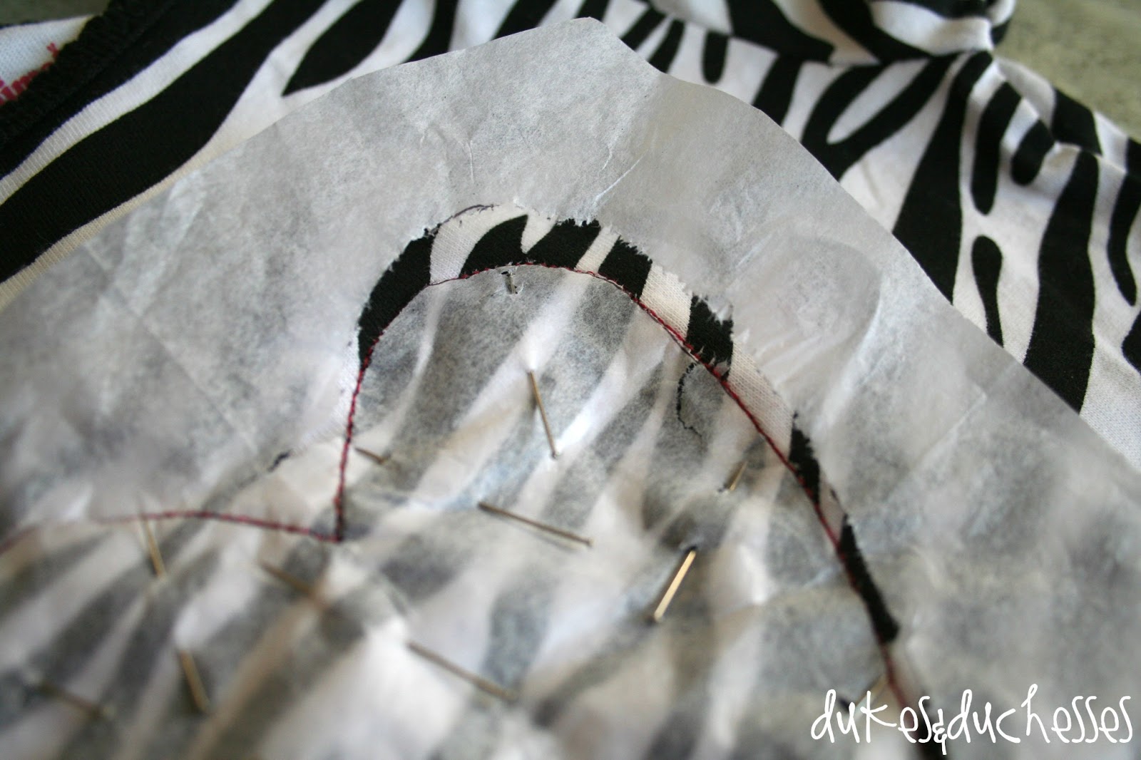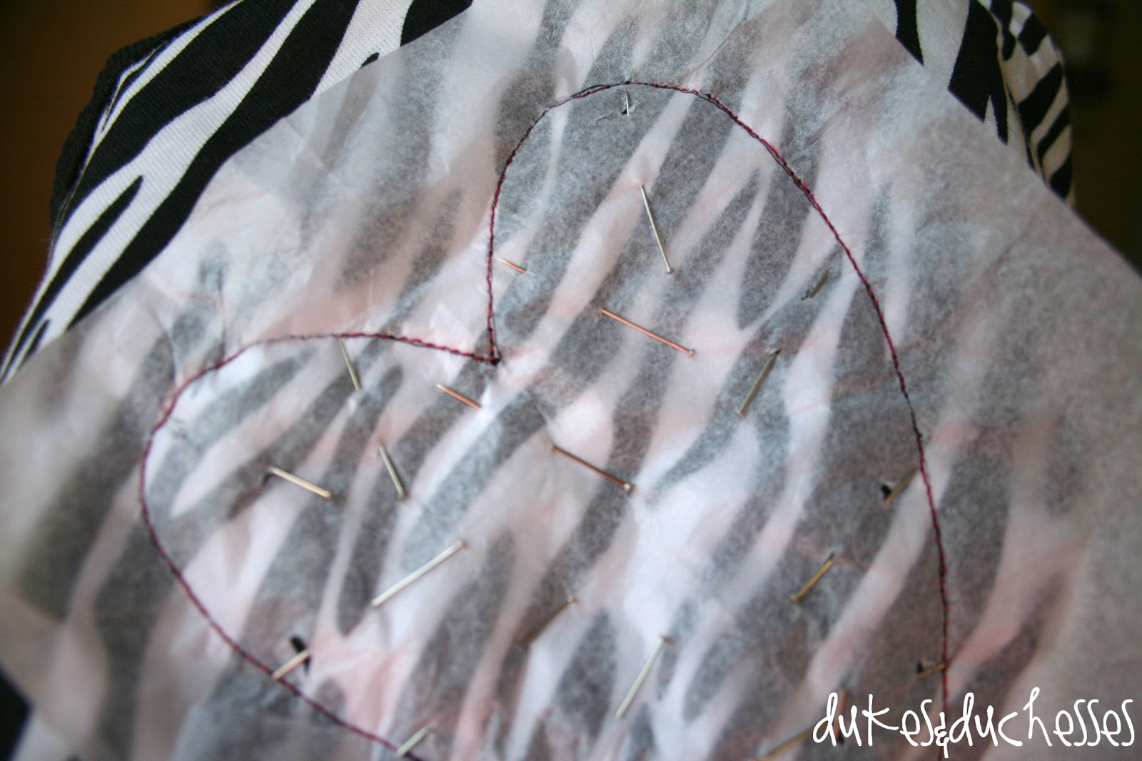 To make the shirt, I pinned the ruffled fabric to the inside front of the shirt, right side up, then pinned a heart template over top {drawn on tissue paper}. You can freehand the heart or use a stencil or a heart printed from your computer.