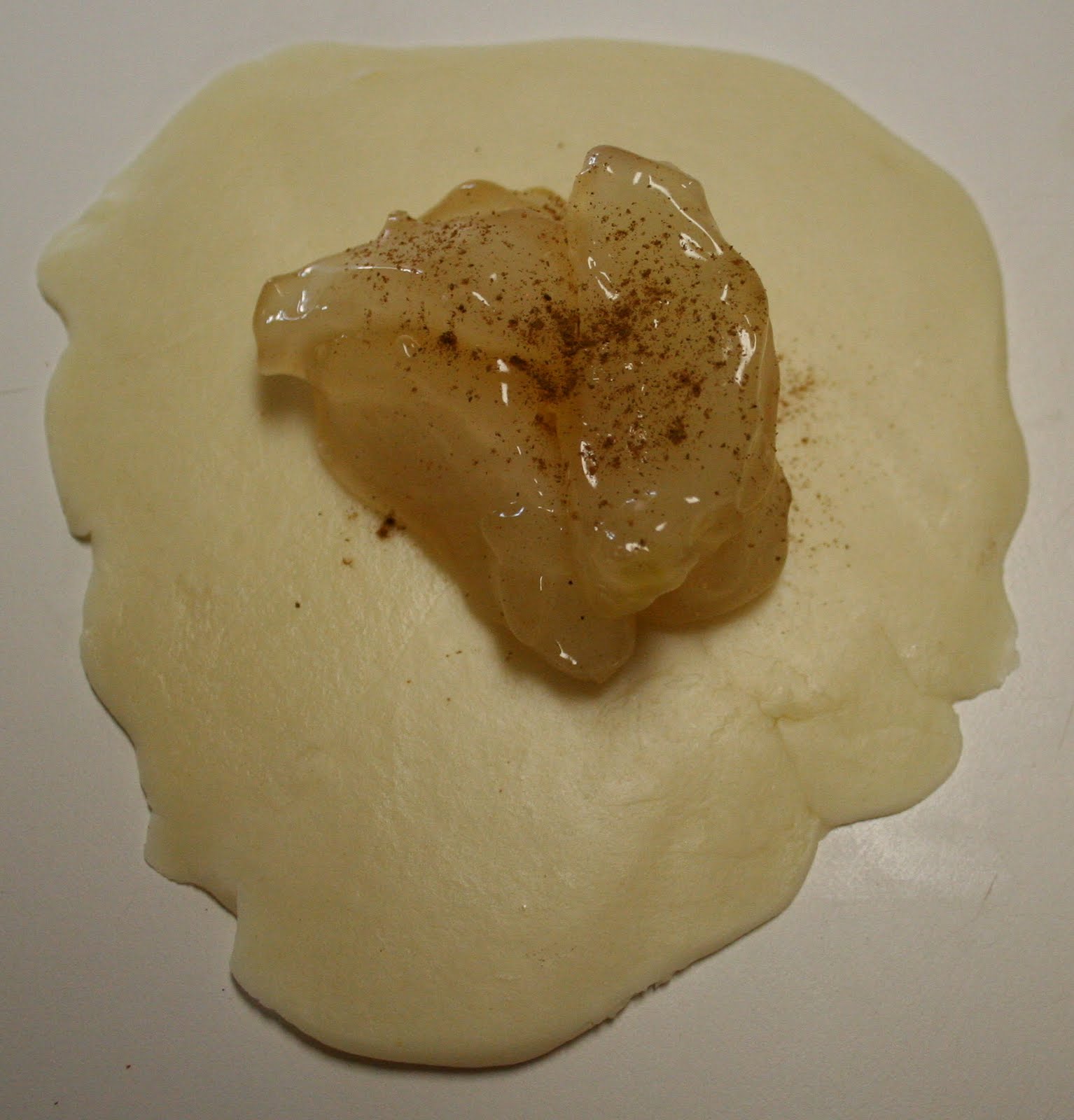 I put a dollop of pie filling {apple or peach} on each circle and added a sprinkle of cinnamon …