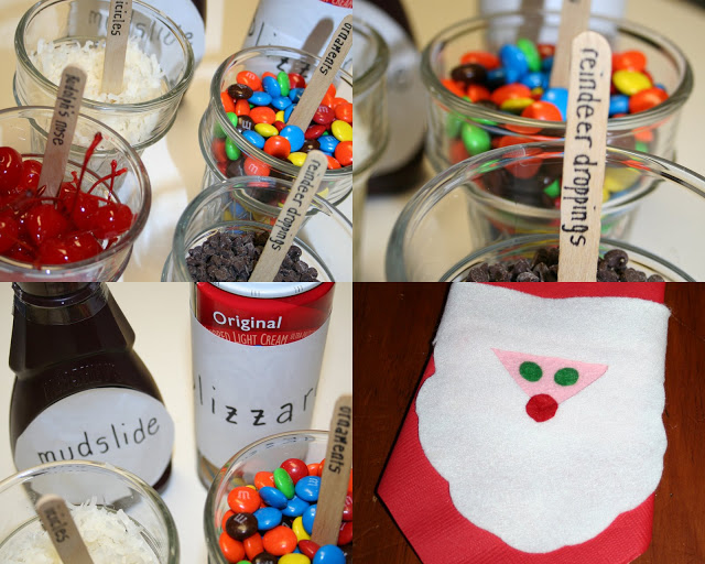 I love to celebrate the holiday season by being deliberate about spending time with people. Tonight we had friends for dinner … a simple dinner of soup and chili, corn muffins and biscuits, followed by Sweet Snow (vanilla ice cream) and some festive toppings: reindeer droppings (mini chocolate chips), ornaments (M&M’s), Rudolph noses (cherries), icicles (coconut), mudslide (chocolate sauce), and blizzard (whip cream). The table was set with fun Santa napkin holders (the red napkin completes the hat) made by my Mom years ago.