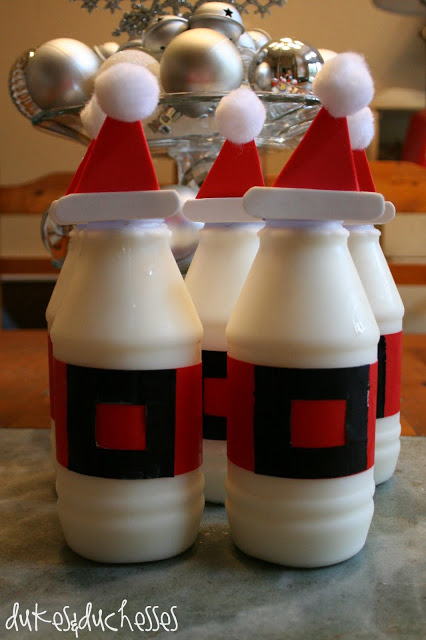 Inspired by this, little bottles of milk became Santa milk. I copied the craft foam hat idea but used white pom poms on top and then glued the hats to the front of the caps to hide the blue lids.