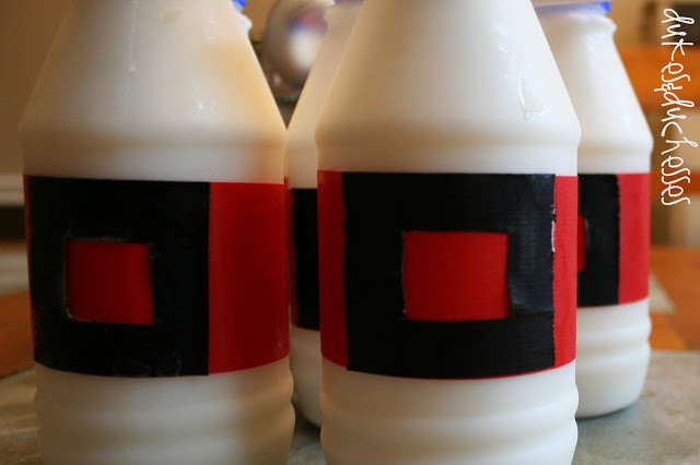 Rather than wrapping paper around the bottles, I made Santa suits and belts from red and black duct tape {I wrapped the bottles in red duct tape then cut the center out of a square of black duct tape for the belt buckle}.