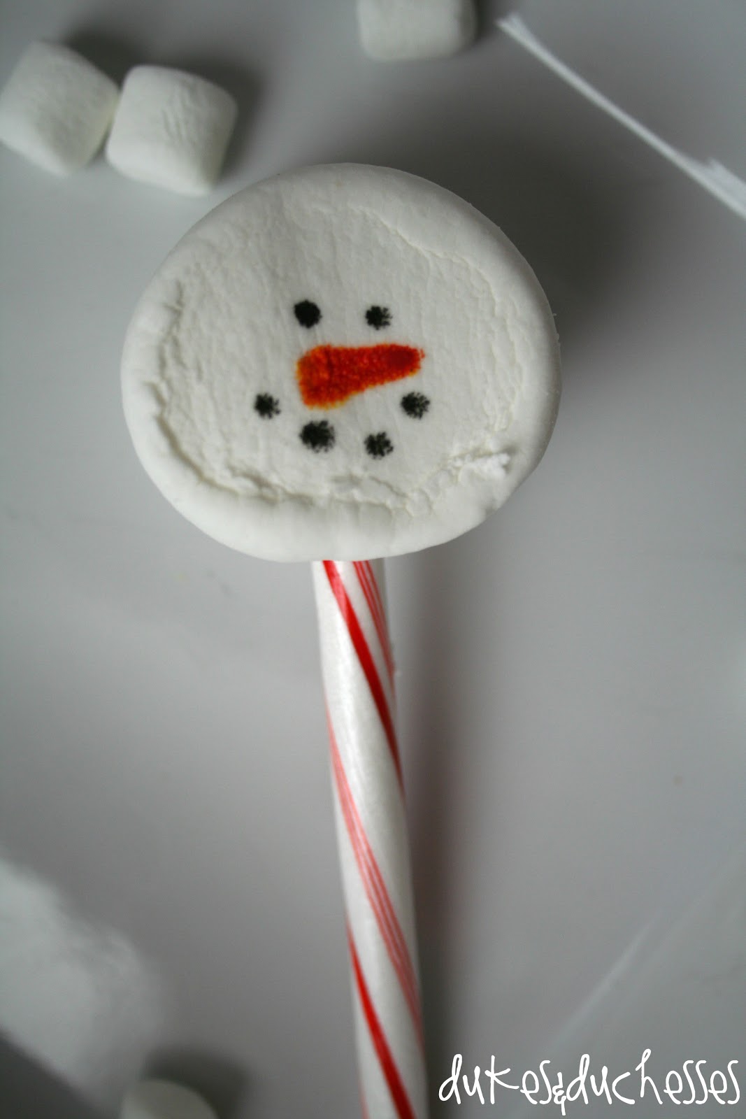 I used edible markers to draw a face on the end of a jumbo marshmallow {my edible markers didn’t have orange so I mixed red and yellow together} and stuck it onto a candy cane {I broke off the curved end}.