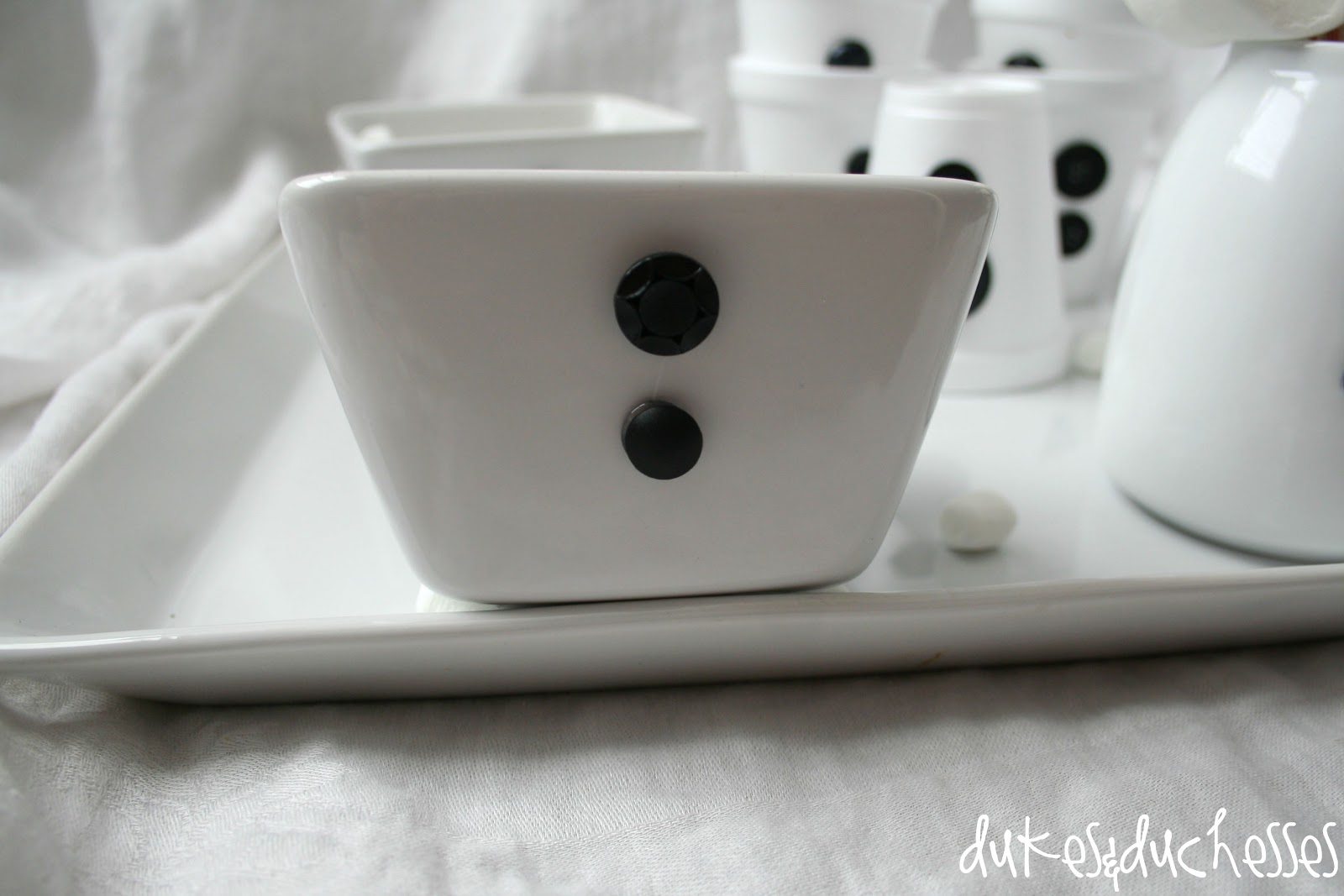 This party requires just a few basics: some white dishes, some black buttons, and the ingredients for a great cup of cocoa.