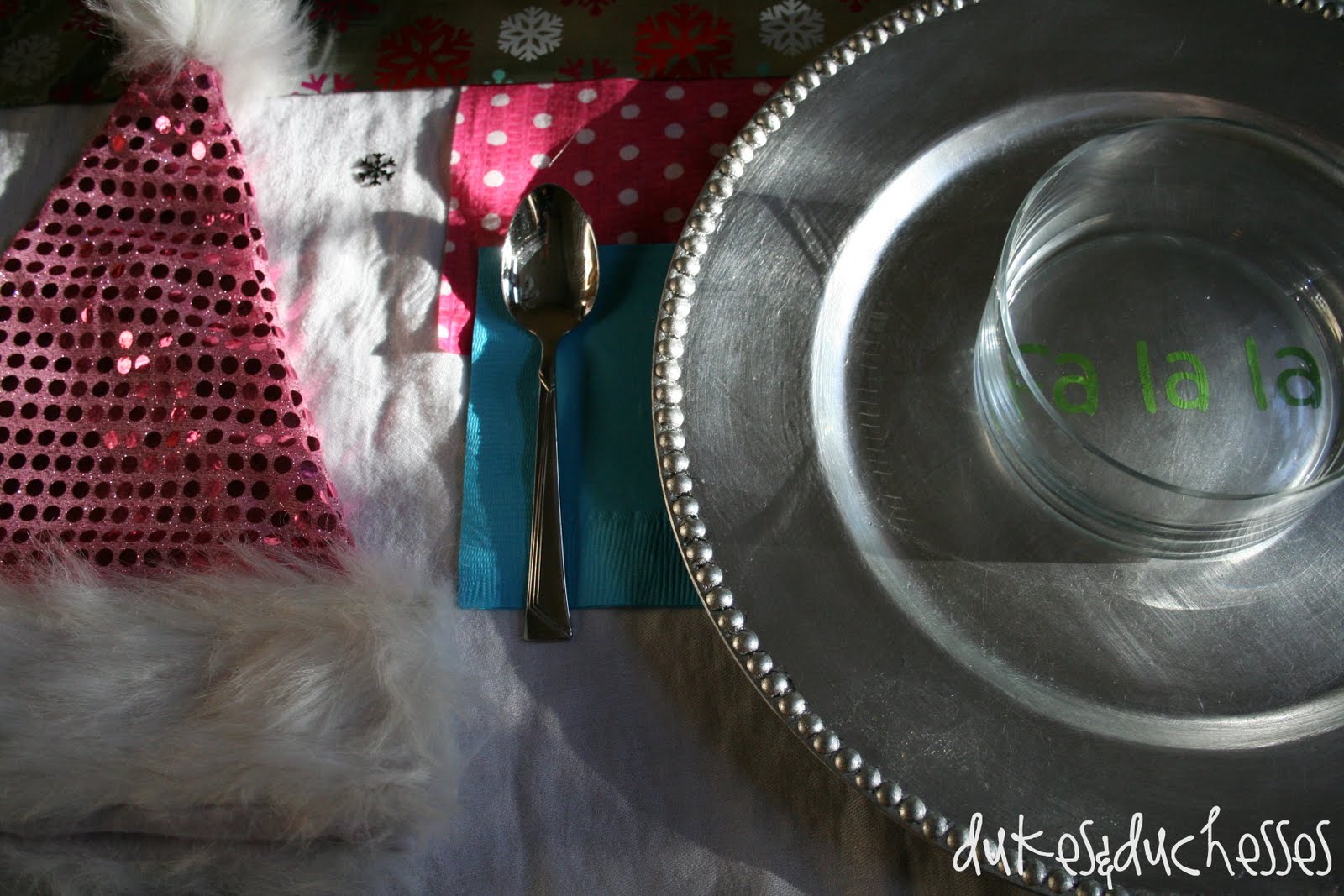 Each place was set with a silver charger embellished with “fa la la” in green vinyl {made with my cutting machine} …