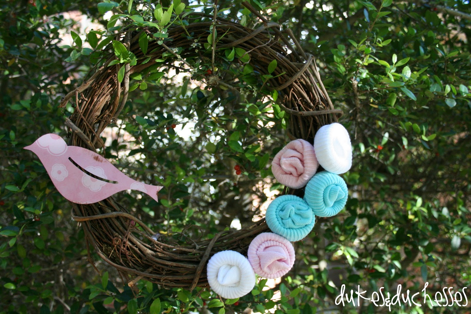 I co-hosted a baby shower last year and came up with this rosette wreath for the front door. The little rosettes are made from rolled up baby socks which the new mom could take off and use after the shower. Little sock rosettes would also make a super cute baby gift topper.