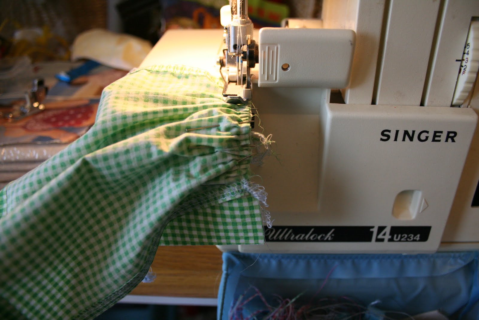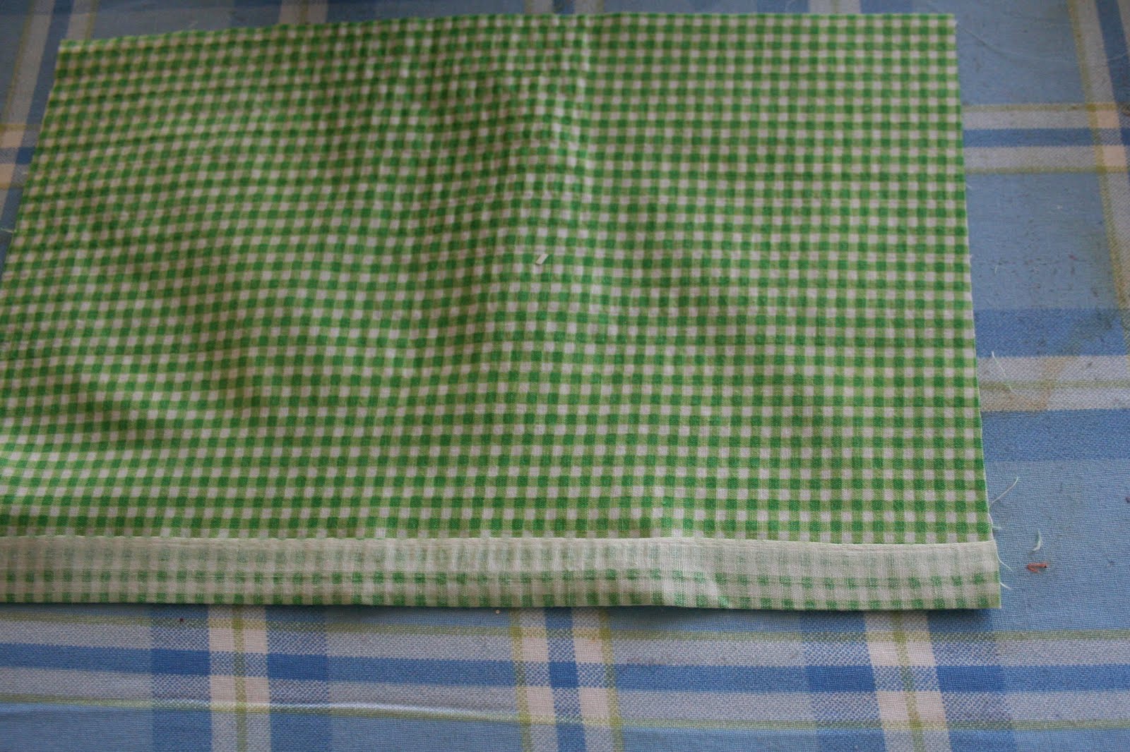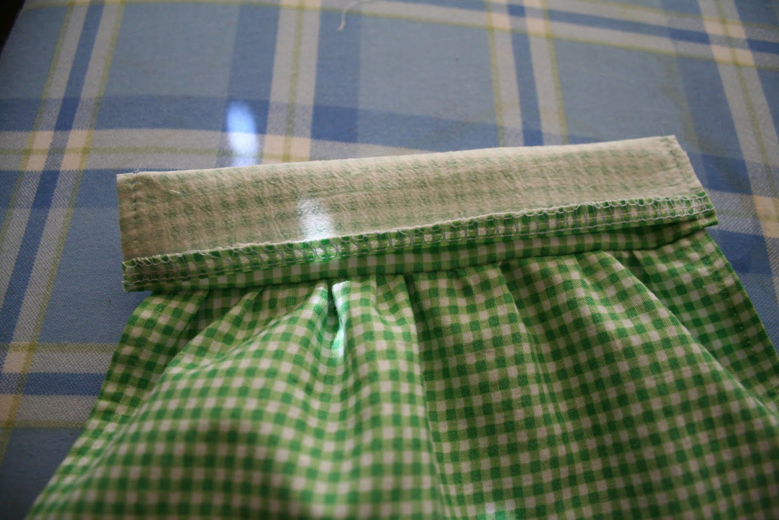 To make the apron to attach to the front of the dress, I cut a rectangle shape from a coordinating piece of fabric, serged the raw edges, then folded up 1/2 an inch on the bottom and sides and sewed them in place to create finished edges.