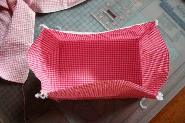 Measure the sides and bottom of the inside of the basket and add a seam allowance {I added 1/4 inch on each side to account for my serged seam} then cut your pieces according to the measurements. {I added 3/4 inch on the top edges to allow for the folded edge in the next step.}