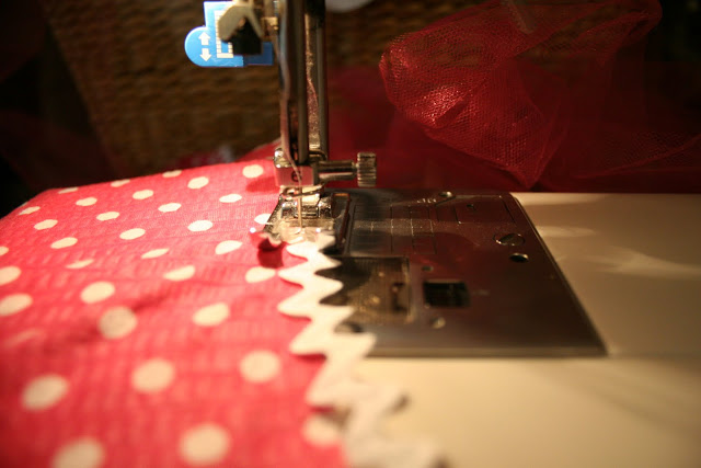 Onto the little picnic blanket. Since the basket isn’t very big, I didn’t want a big bulky blanket so this blanket is just one thickness of fabric … I didn’t back it with anything. Cut a square of fabric and, using a zig zag stitch, sew ric-rac along the edge.