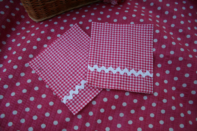 To make the napkins, cut two rectangular pieces. Sew a line of ric-rac an inch or so from the edge, then fold the fabric in half, right sides together, and stitch two of the sides. Flip the napkins right side out, sew the final seam {since I hate hand sewing, I just sewed it with my machine and kept the stitch line as close to the edge as possible.}