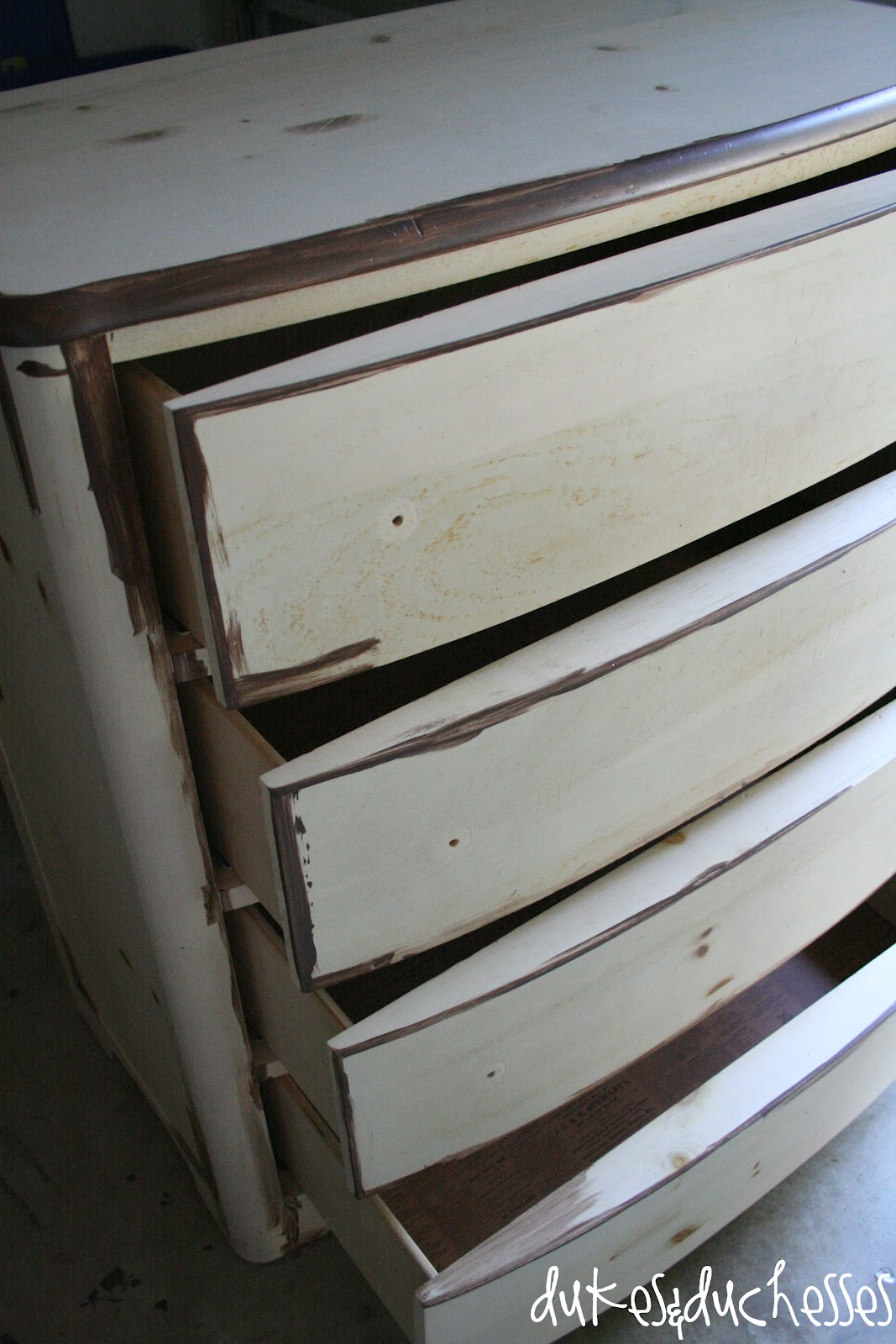 Knowing that I would paint the dresser and then distress it, I first painted some edges brown …