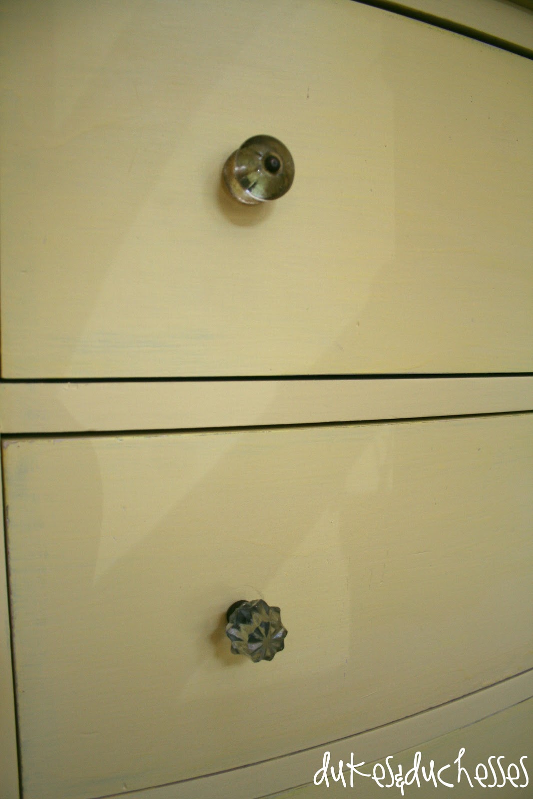 … then rubbed the dresser with finishing wax and added some mismatched glass knobs.
