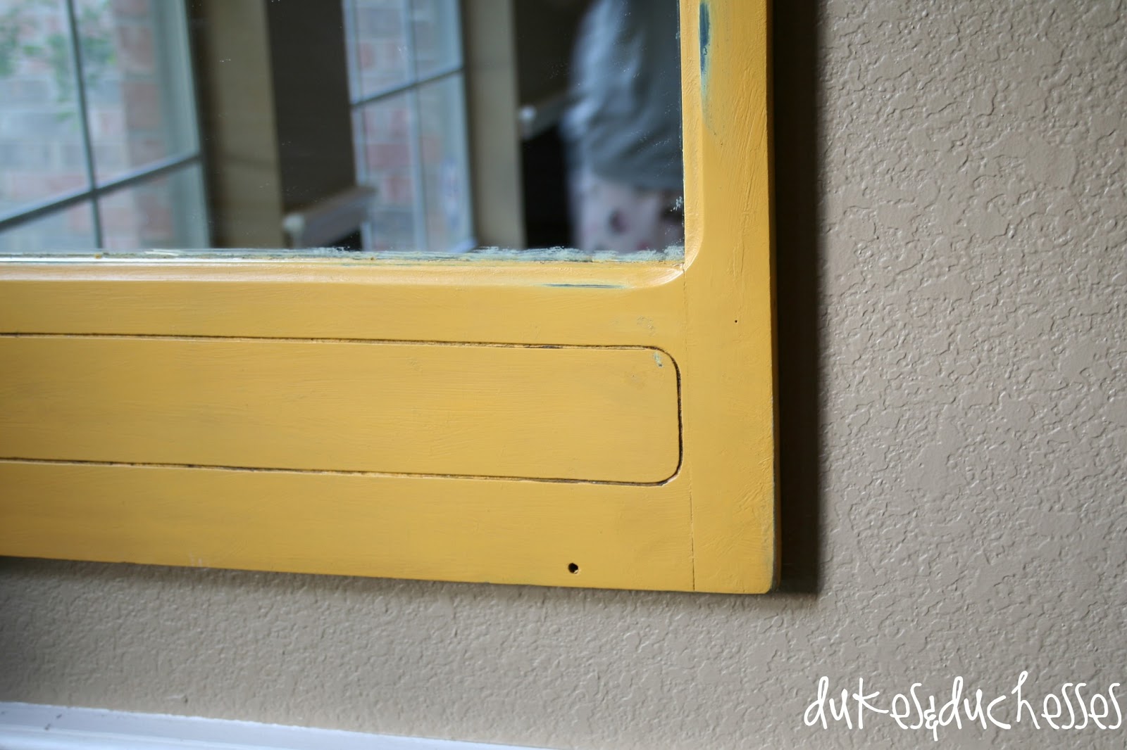The hardest part of this entire makeover was getting the age-old tape off the mirror. It had obviously been sitting in a hot Texas garage or attic for a long time and the tape was melted right onto the mirror. It took a lot of adhesive remover, razor blades, and elbow grease to get it off and you can see that the mirror is still in need of a little Windex.