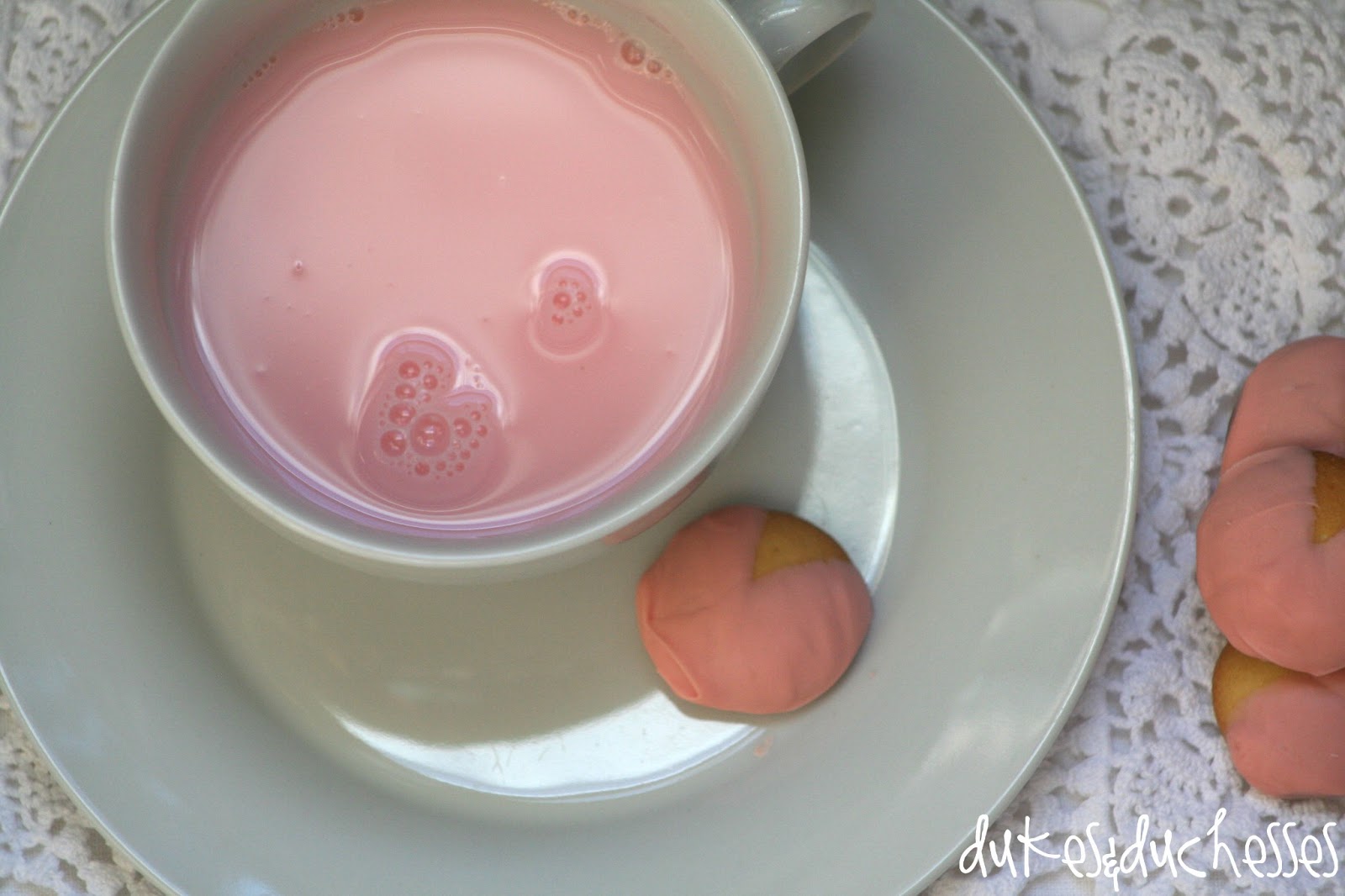Serving them with pink strawberry milk and a crocheted doily is optional …