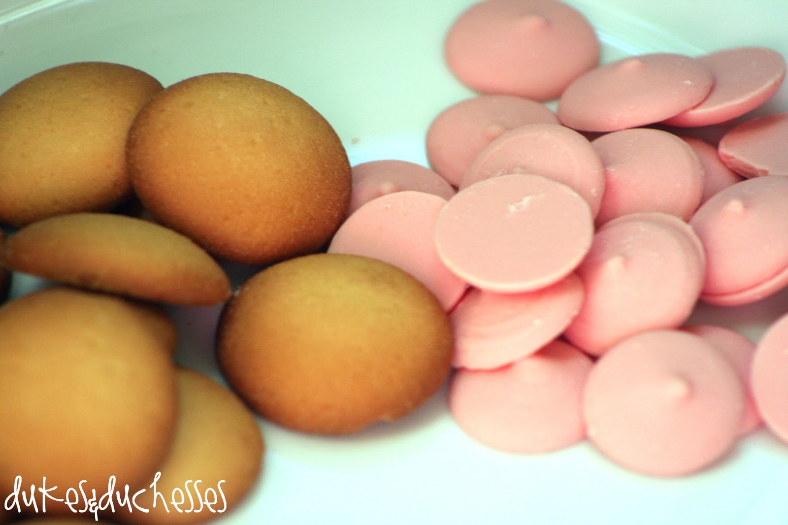 All you need to make these are vanilla wafers and candy melts {I had pink candy melts left over from the doll vanilla wafers we served at Tate’s party but red would be really cute too.}