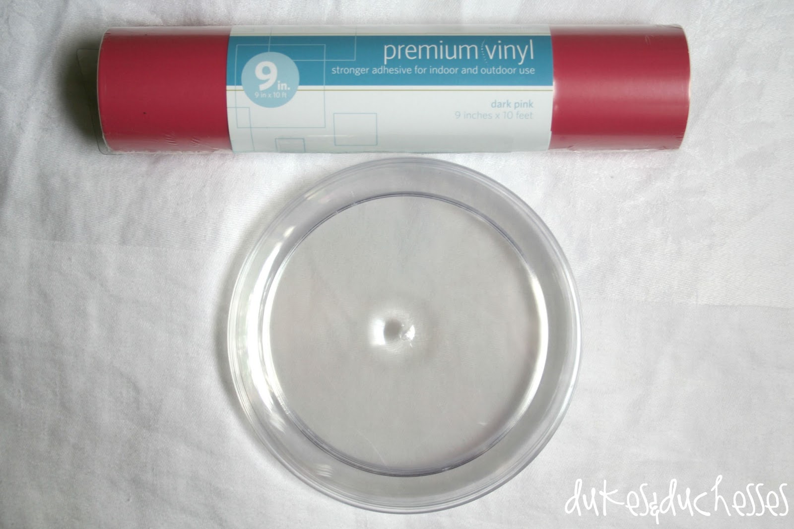 To make these pretty chargers, you’ll need something for your base {you can use chargers or regular plates in any color}, vinyl, and clear plastic plates {I bought mine at the dollar store}.