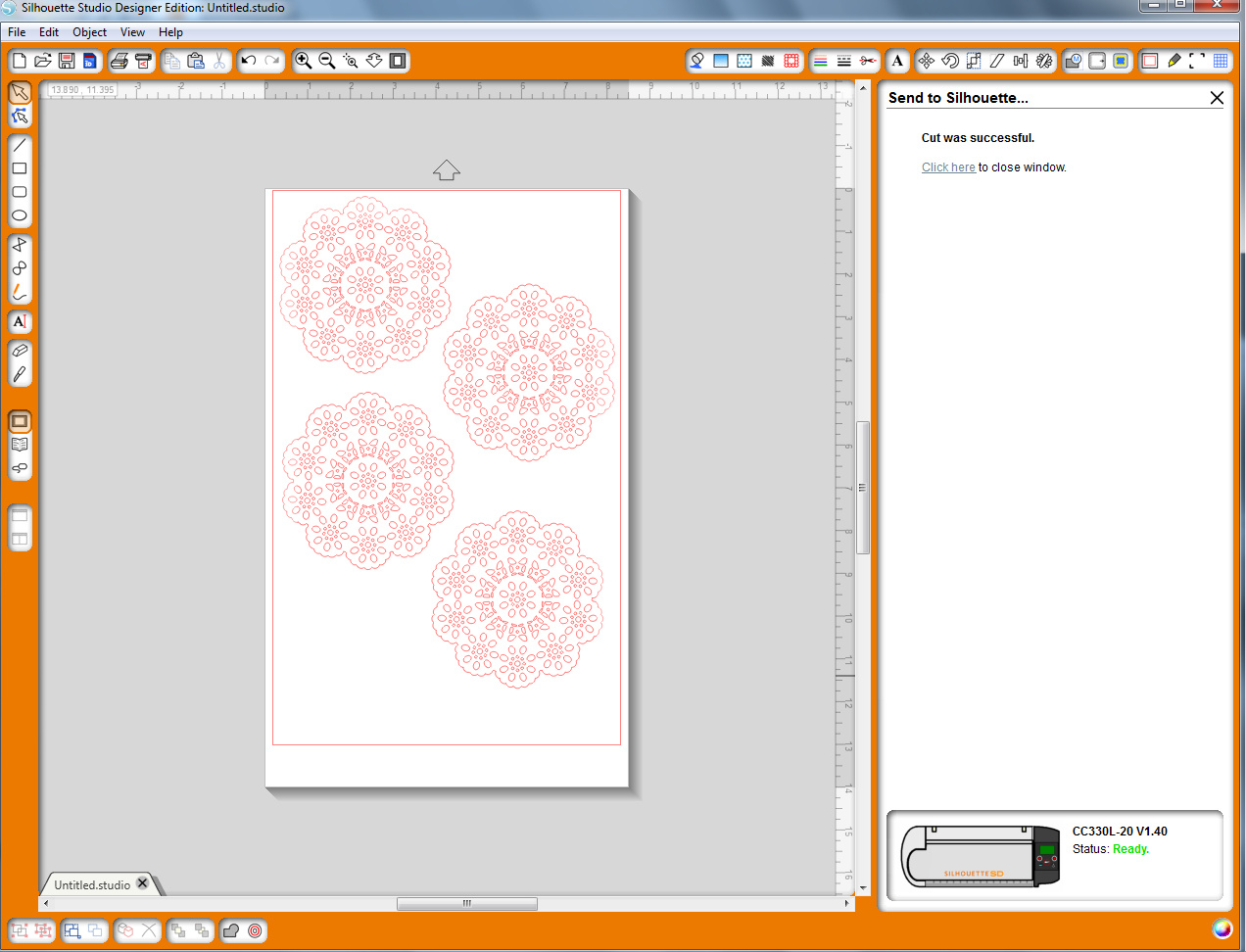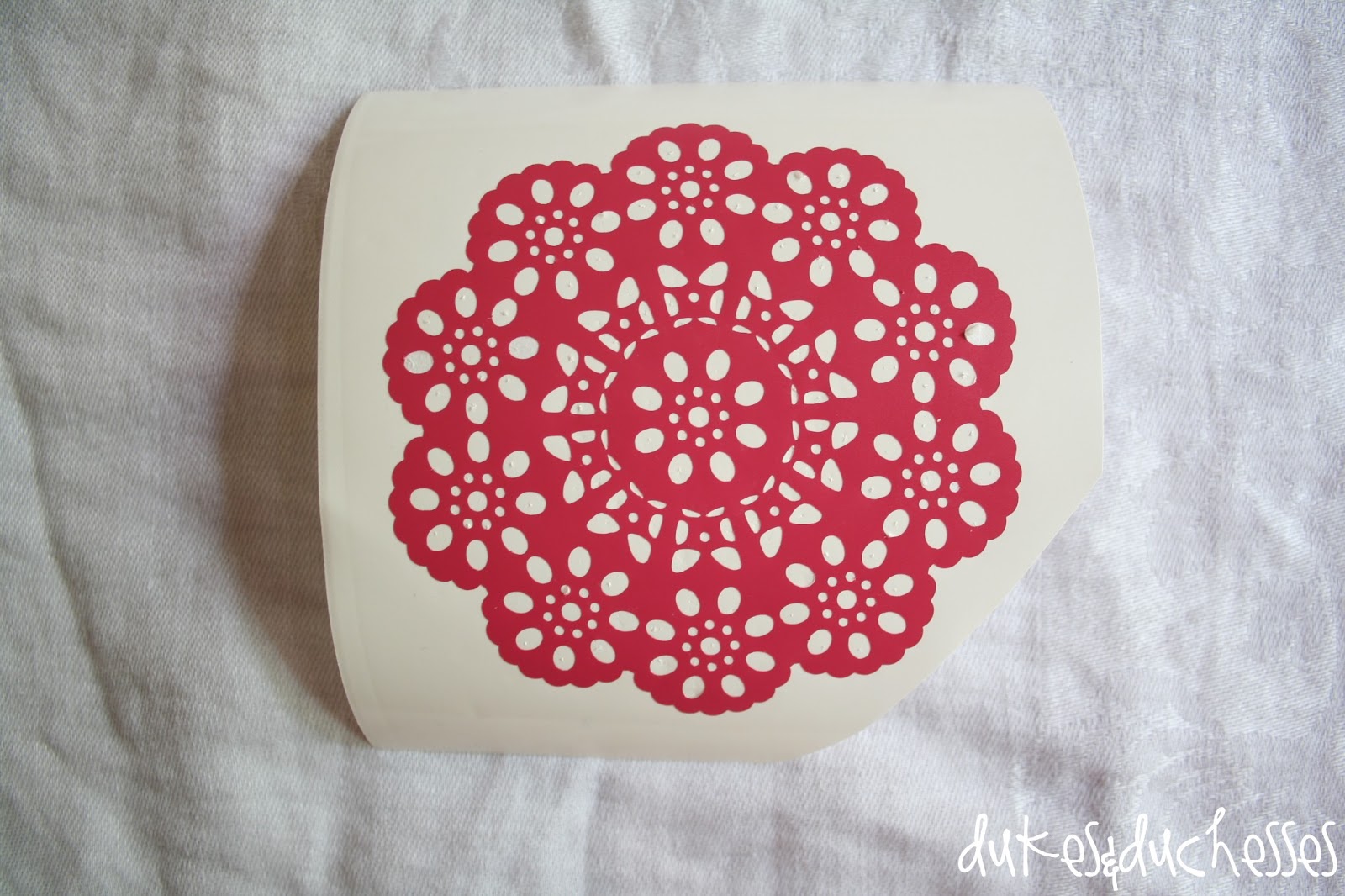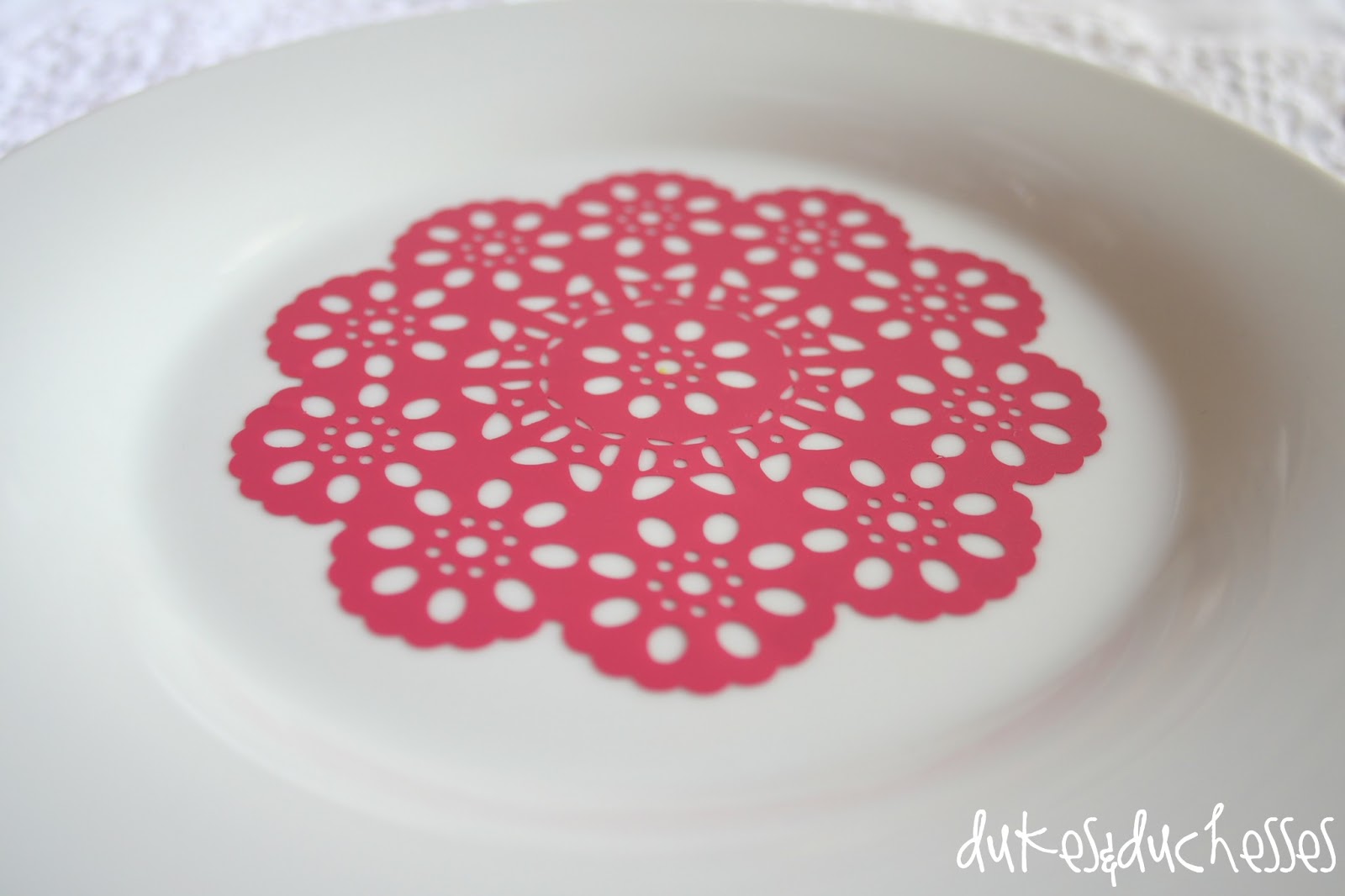 To make the vinyl chargers, I found a doily pattern in the online Silhouette store and downloaded it, then sized it to fit my plate and cut four.